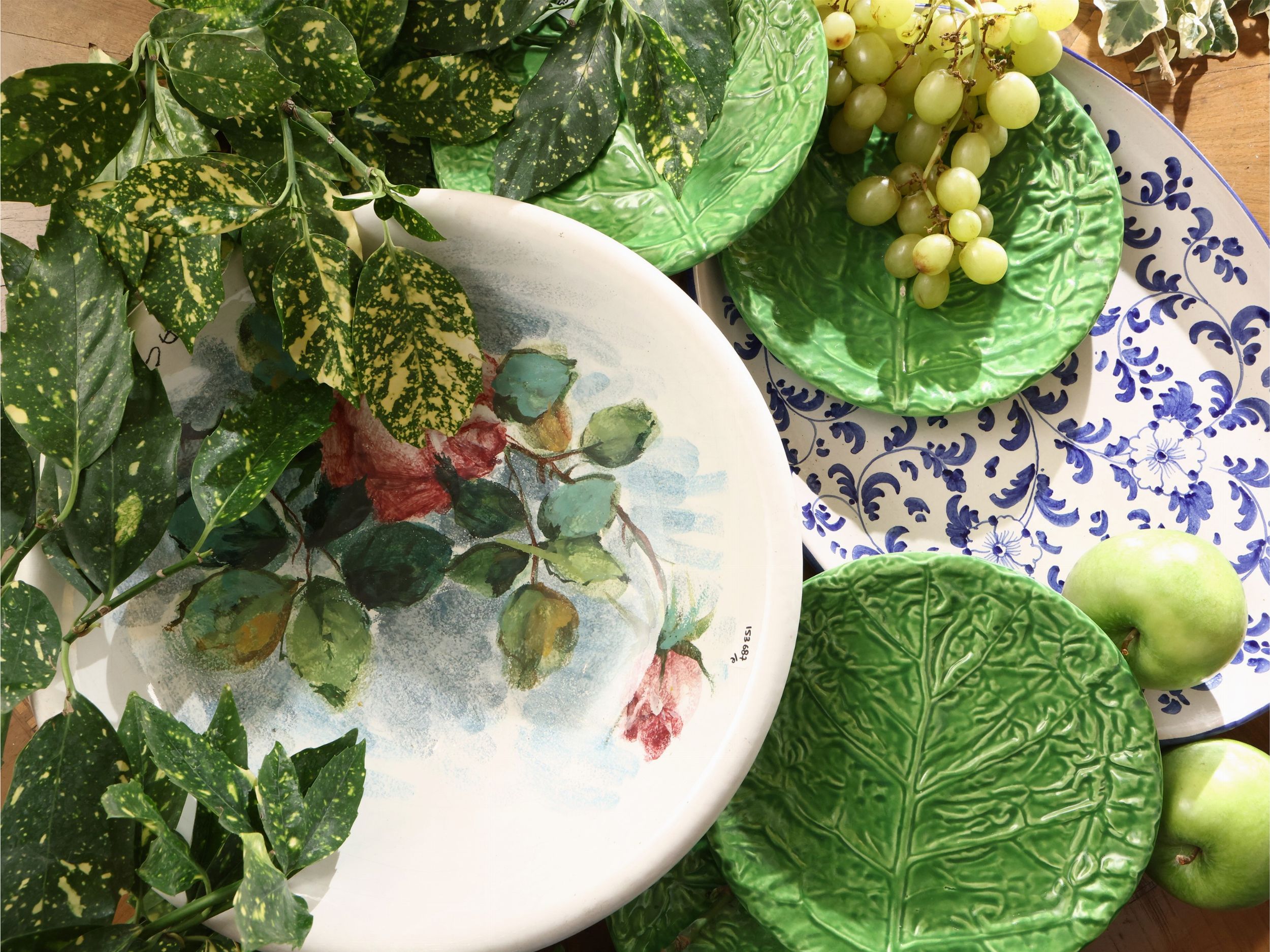 una grande ciotola centrotavola dipinta con motivo di rose, un vassoio ovale ed una serie di otto piatti realizzati come foglie di cavolo, Corsani Lastra, lievi difetti