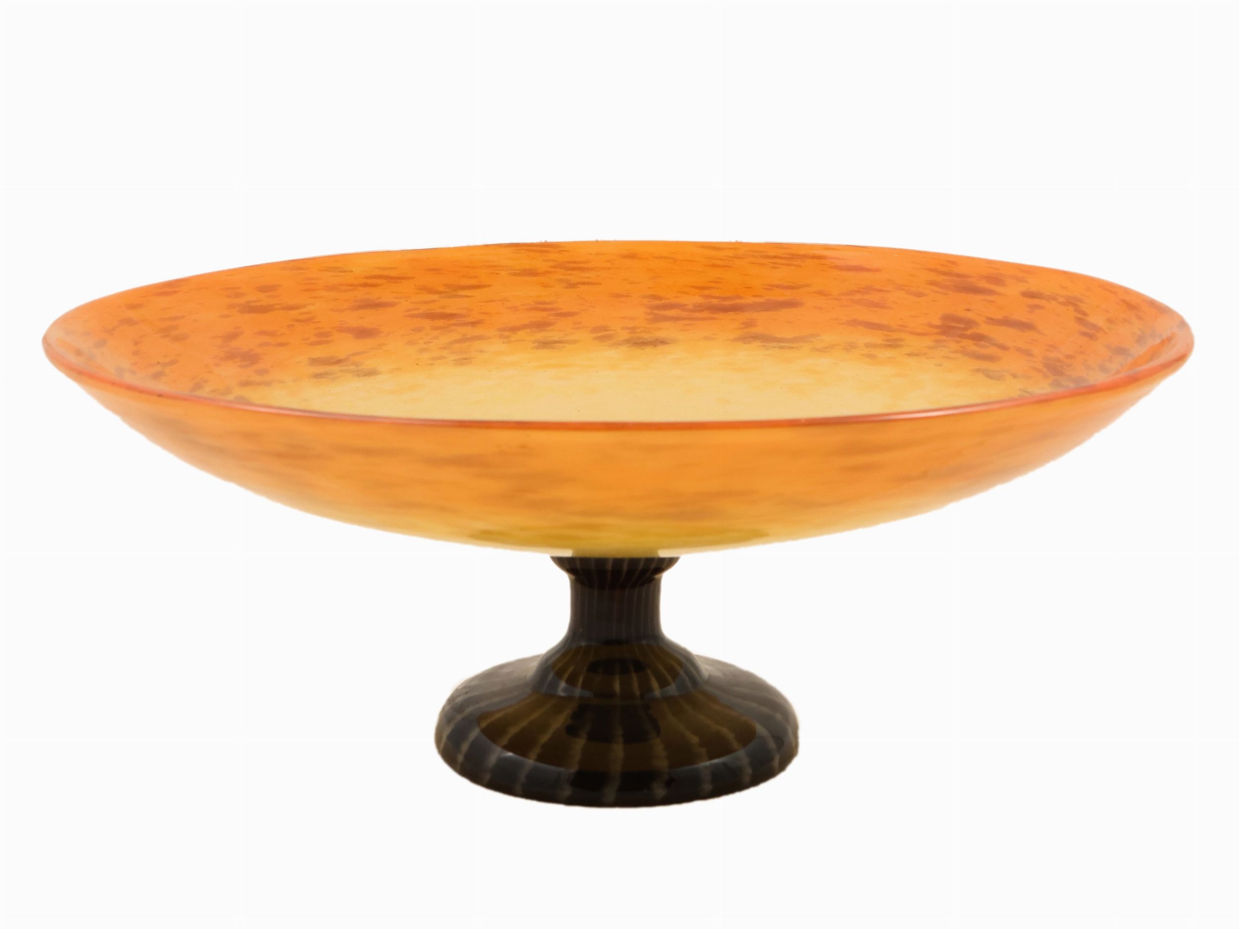 Epinay-sur-Sein, Francia 1922-1924 sui toni del giallo vivo sfumato arancio salmone, piede violaceo applicato a caldo, detto alla veneziana con striature gialle chiare. Firma incisa sul piede Schneider