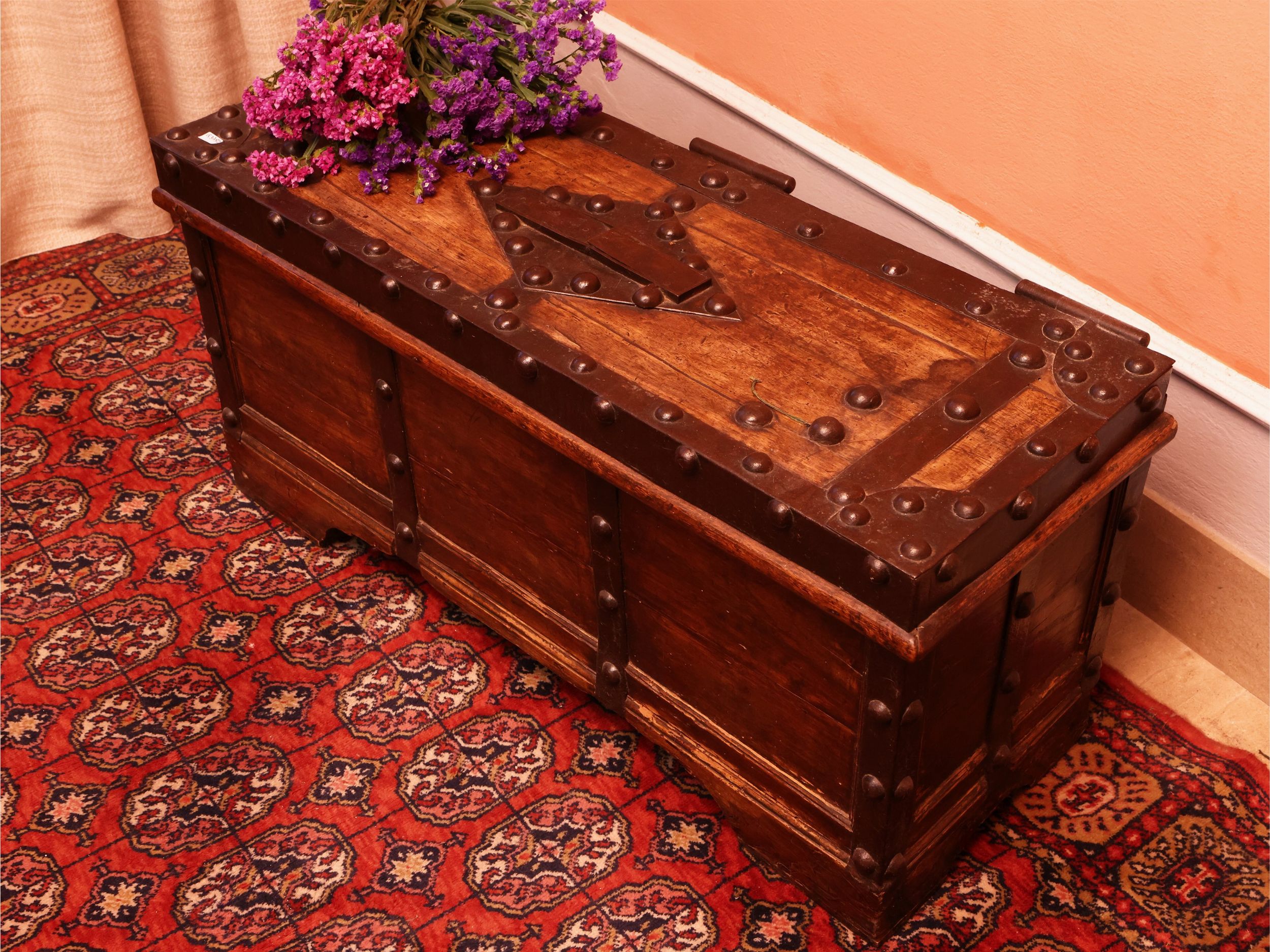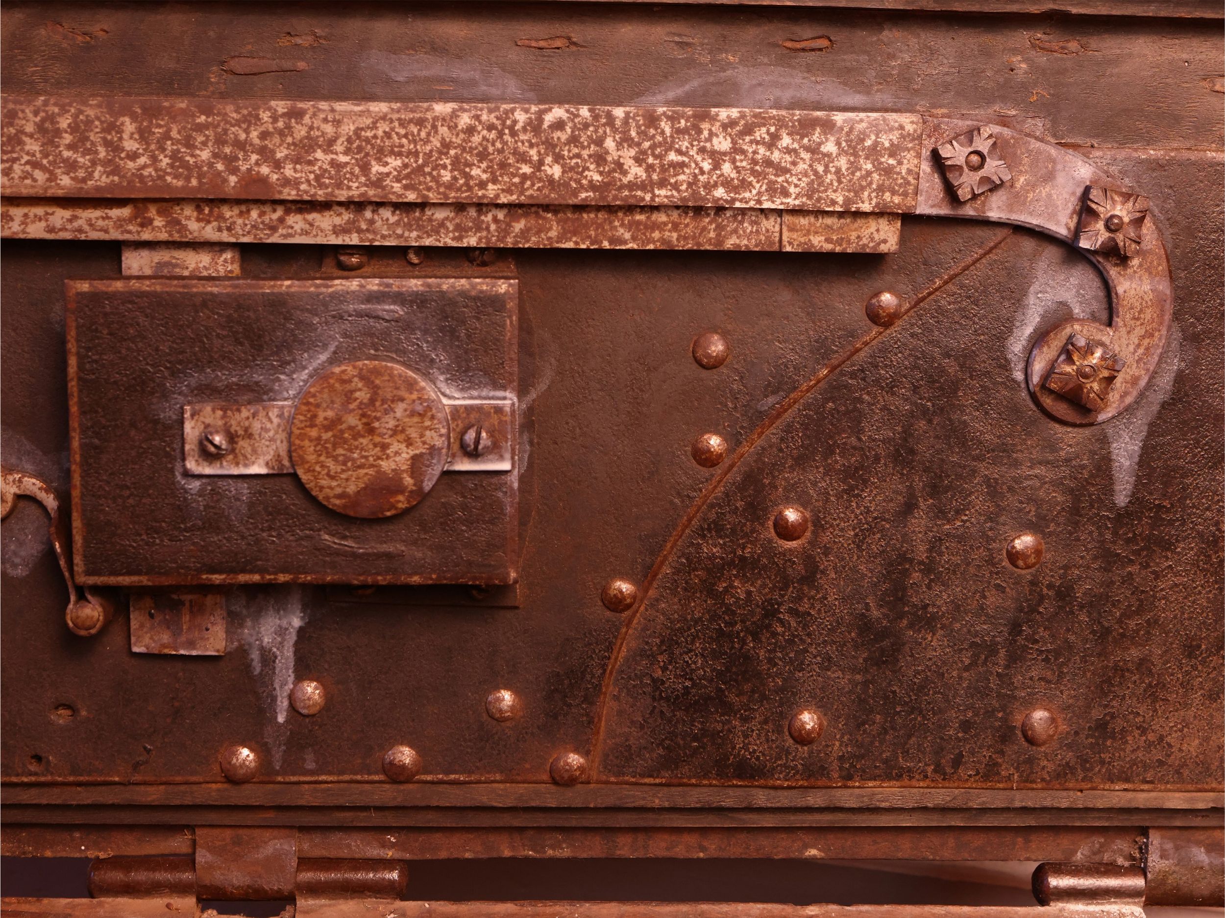 XVIII secolo rilegato in ferro e rinforzato con borchie, all'interno meccanismo di sicurezza a vista, organizzato con vani, corredato da chiave