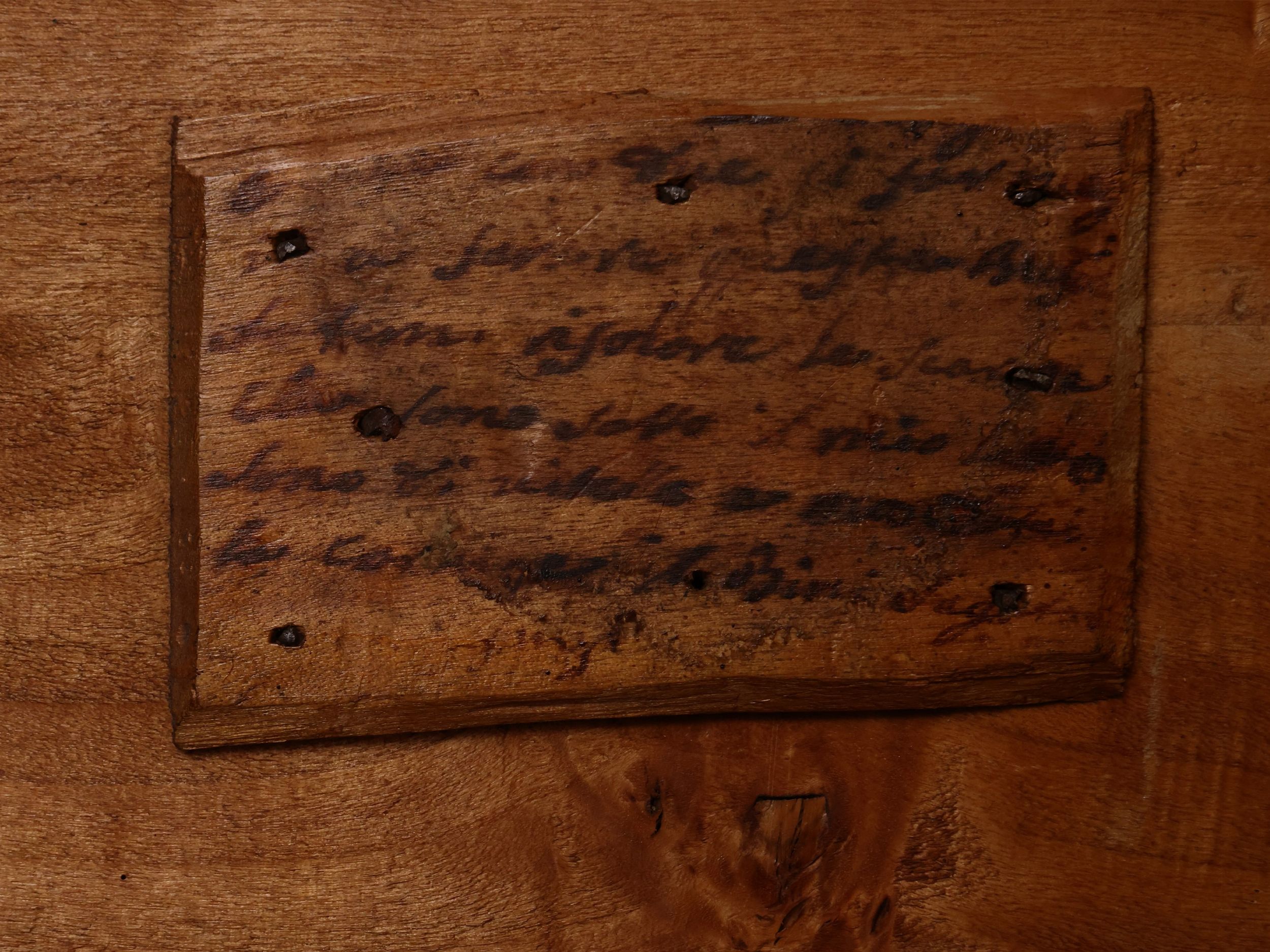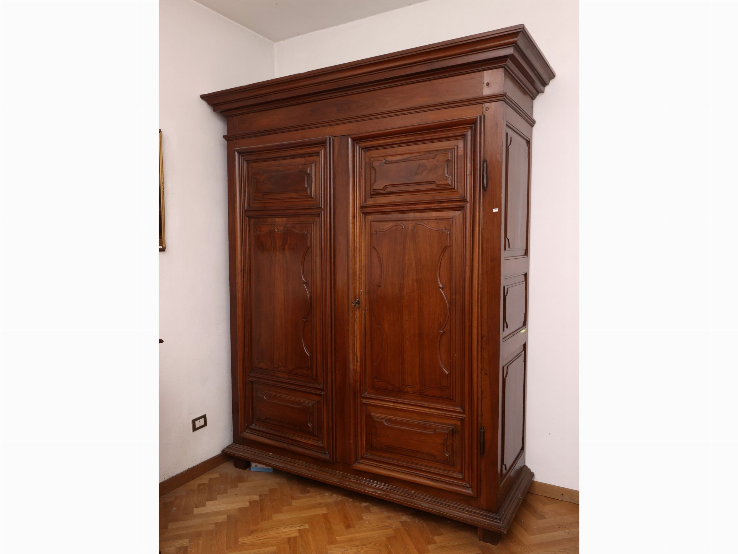 XIX secolo cappello modanato aggettante, fronte dritto a due sportelli con formelle sagomate, piedi a mensola, all'interno vano portaabiti e due cassetti