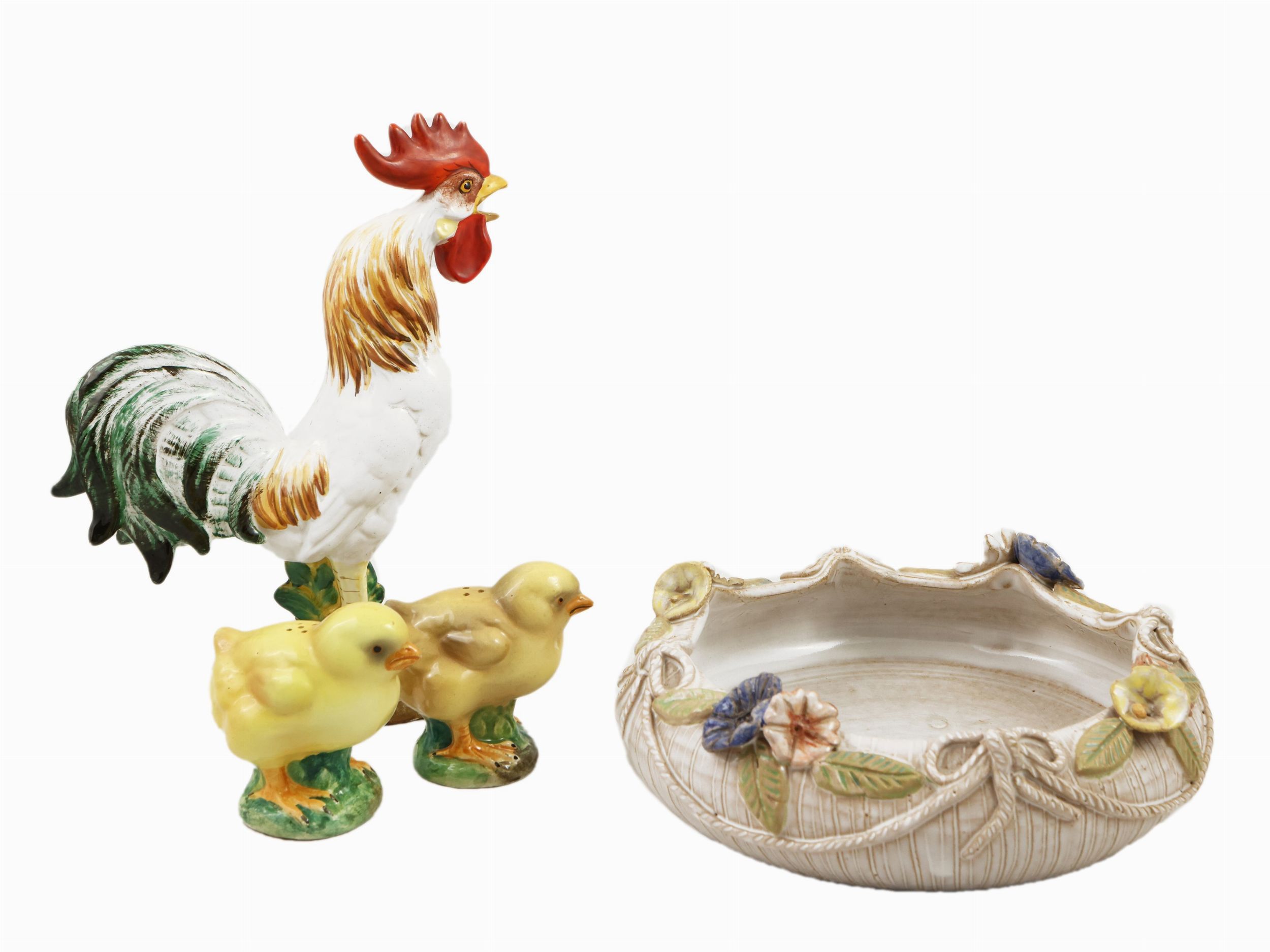 metà del XX secolo composto da una coppa con bordo decorato da applicazioni di fiori in rilievo e motivo a cordonetto, sale e pepe realizzati come pulcini ed una figura di gallo
