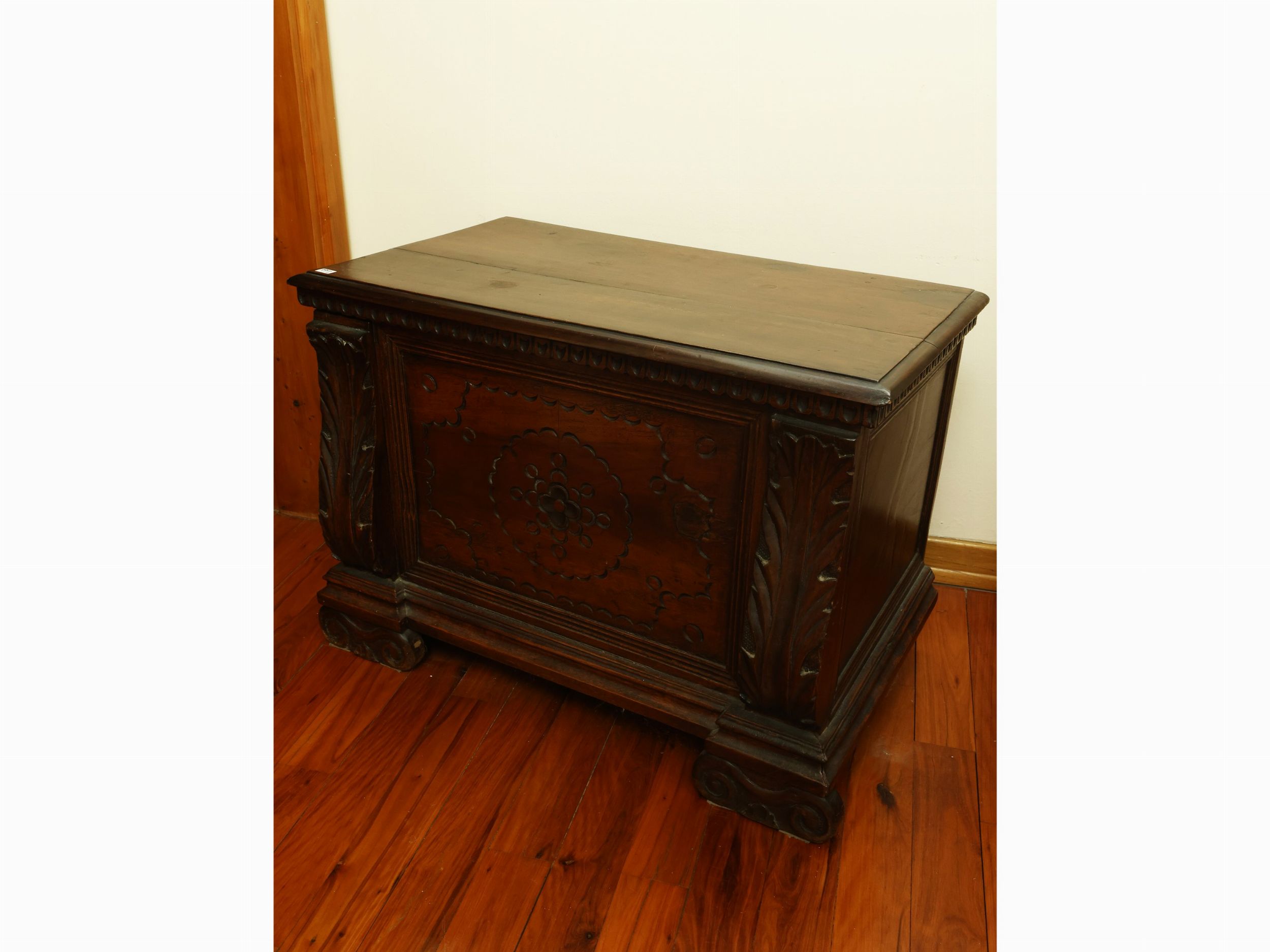 XX secolo fronte intagliato con rosone centrale e motivi vegetali, piano ad alzarsi a celare vano contenitore, alcuni difetti