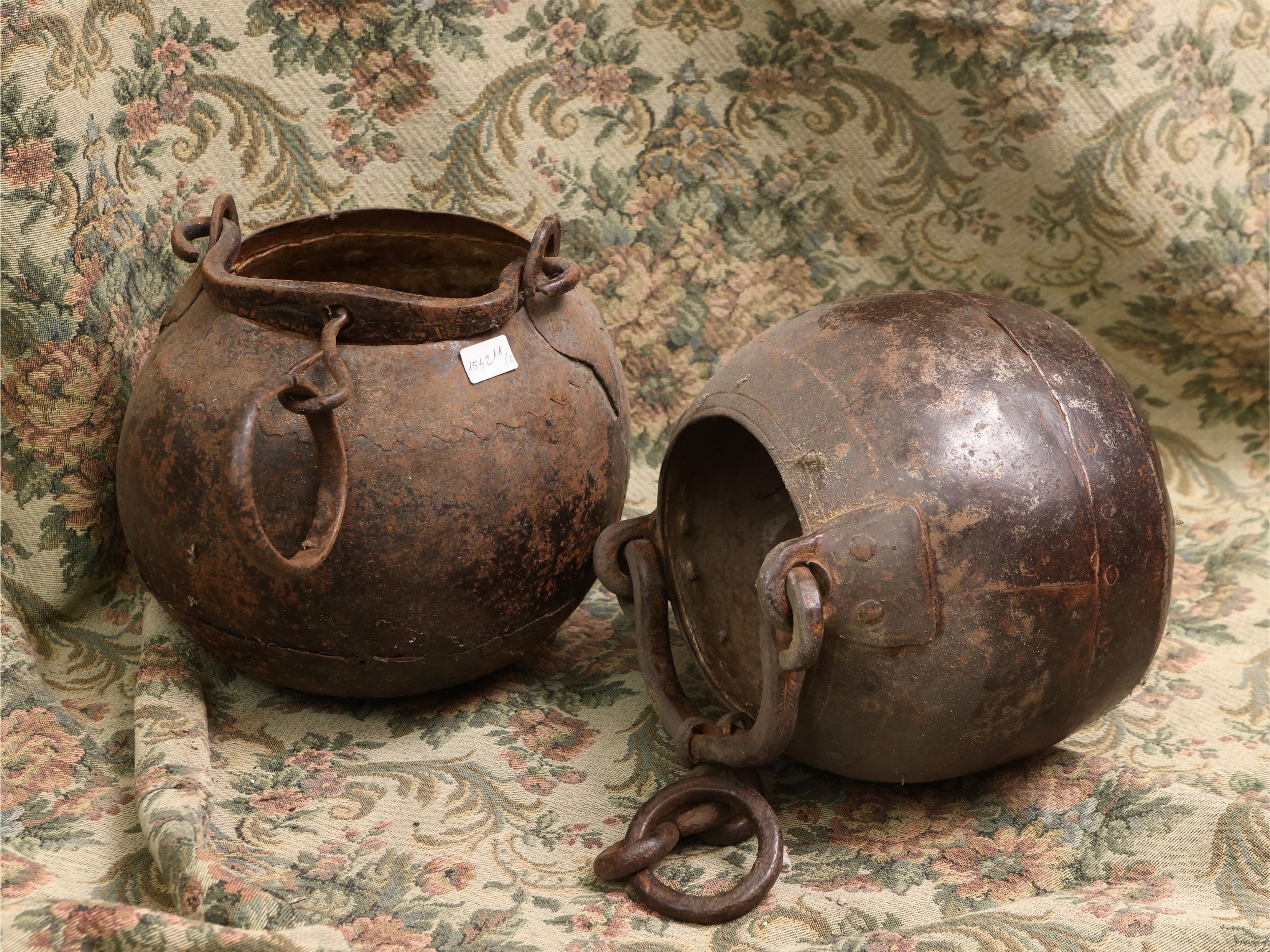 Due antichi secchielli globulari da pozzo in ferro battuto