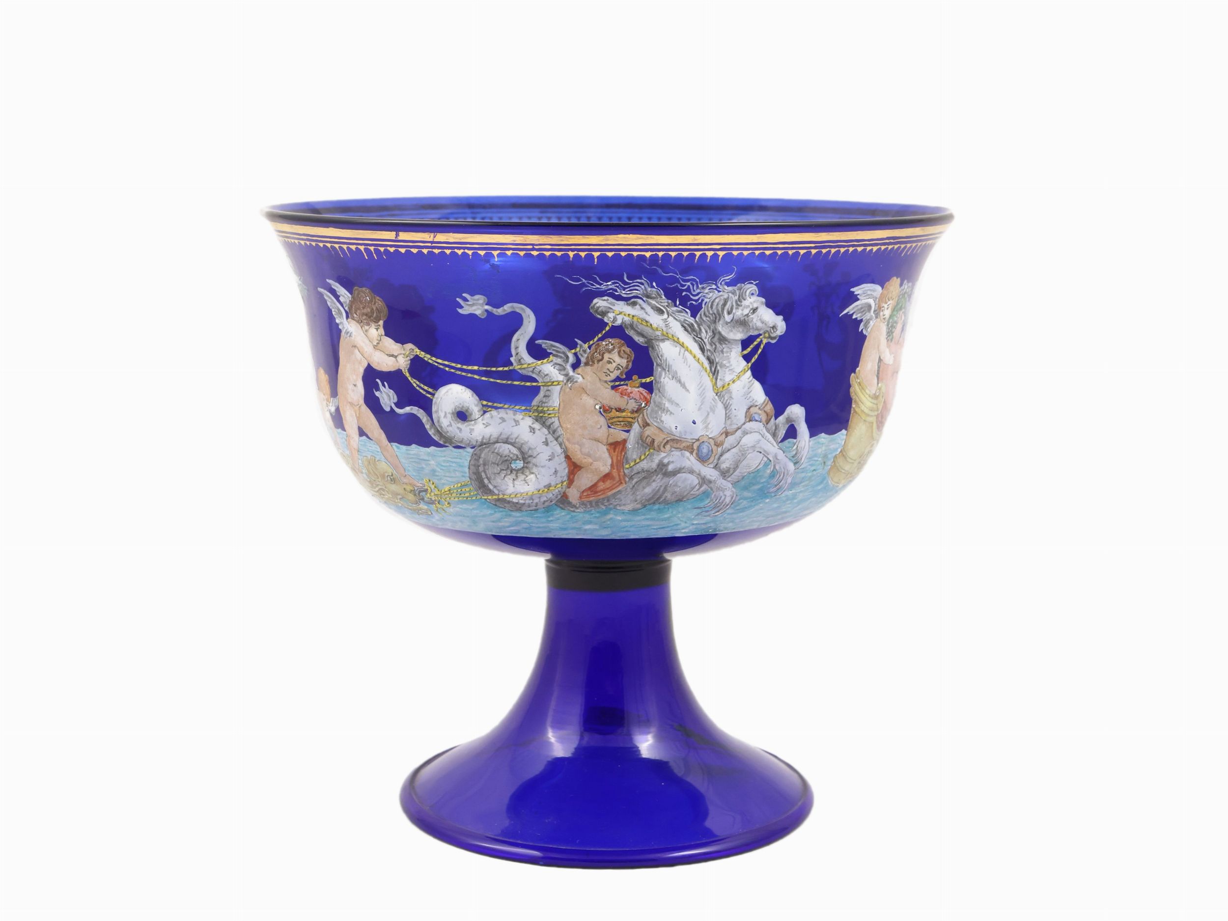XX secolo finemente dipinta con scena mitologica raffigurante il Carro di Cerere ed il Carro di Bacco trainati da ippocampi e puttini, bordo lumeggiato in oro