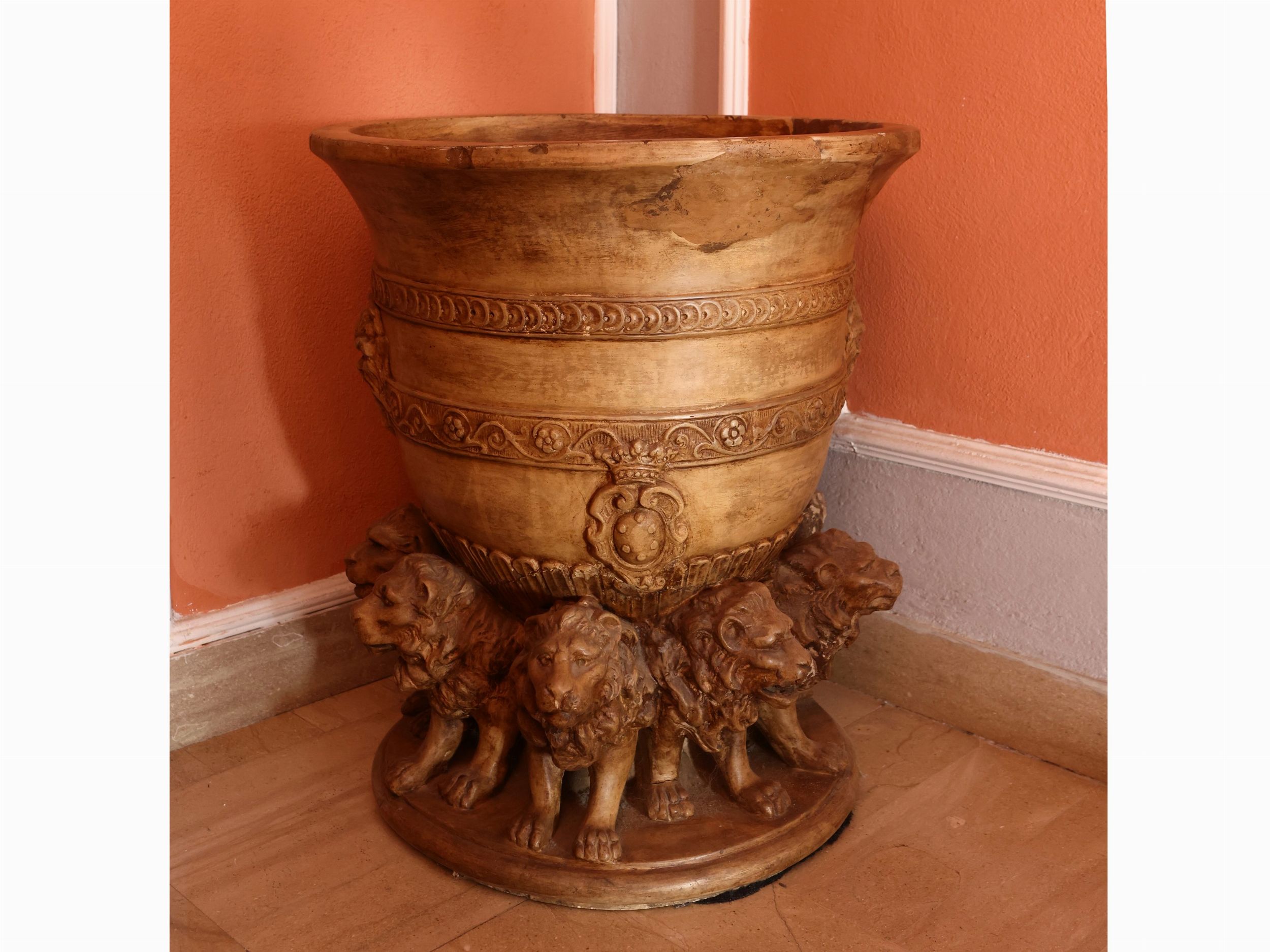 prima metà del XX secolo realizzato come un vaso classico, decorato con mascheroni e stemma mediceo, sostenuto da otto leoni, difetti e restauri
