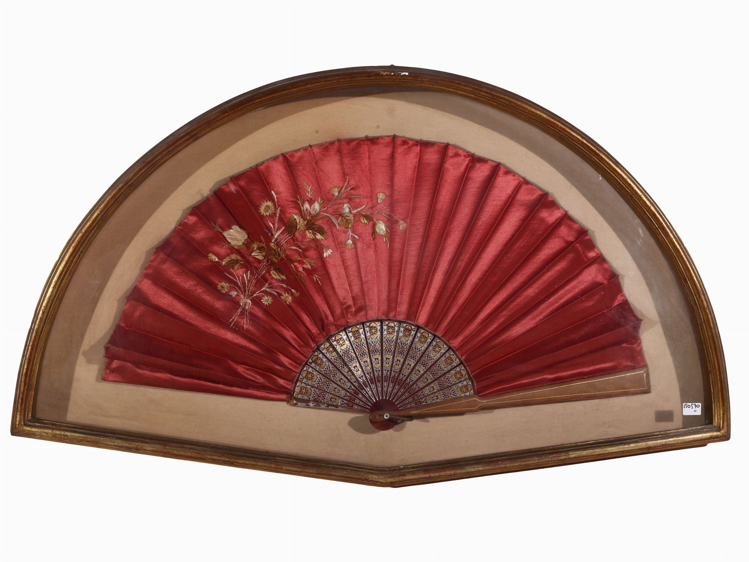 inizio del XX secolo pagina in raso rosso ricamata con motivi floreali nei toni del bronzo, stecche in legno lumeggiato in oro, entro cornice a teca, alcuni difetti