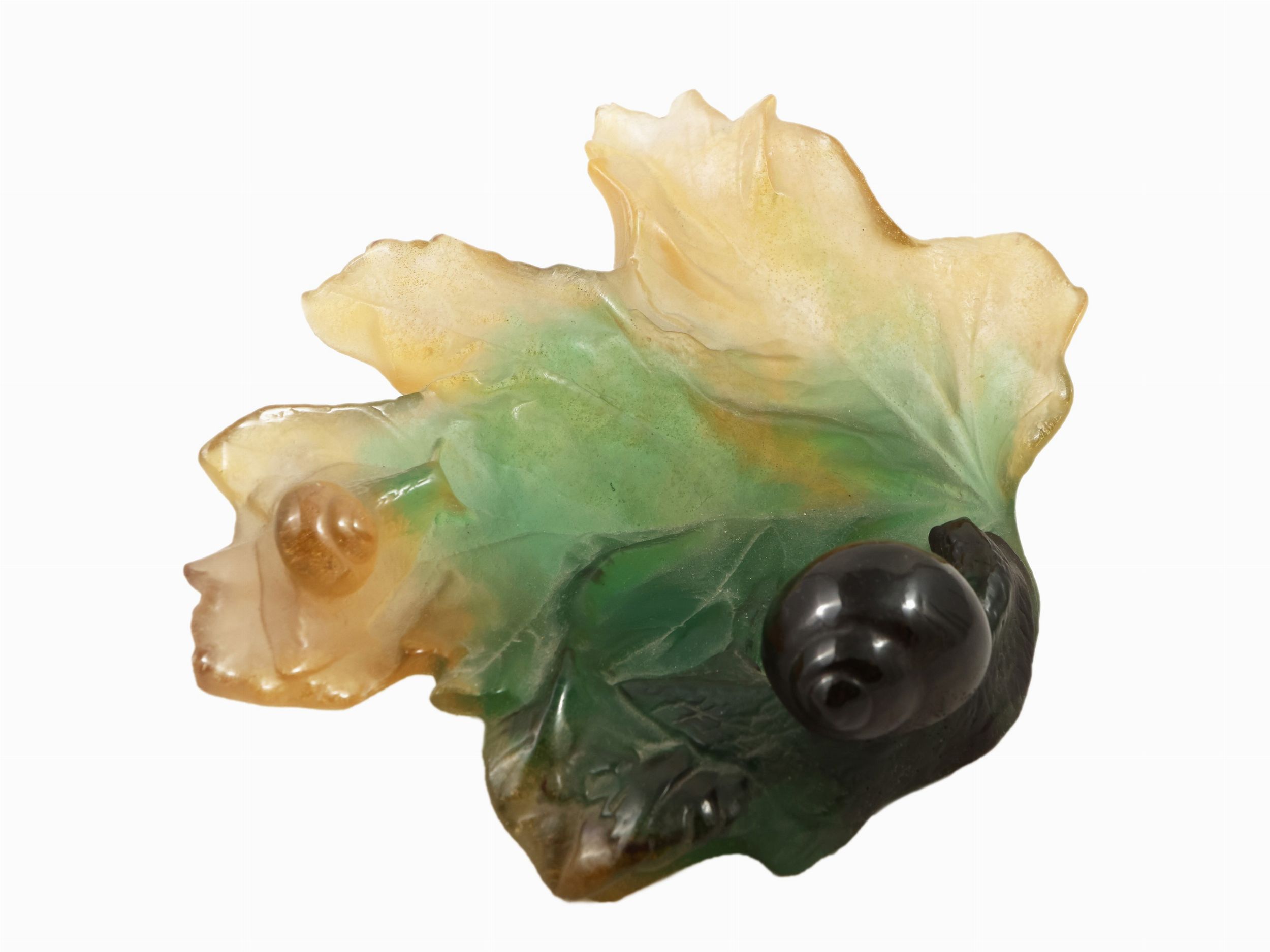 Nancy, Francia seconda metà del XX secolo raffigurante una foglia con adagiate due lumache nei toni del verde e del giallo arancio. Compagnie Français du cristal Daum Nancy France