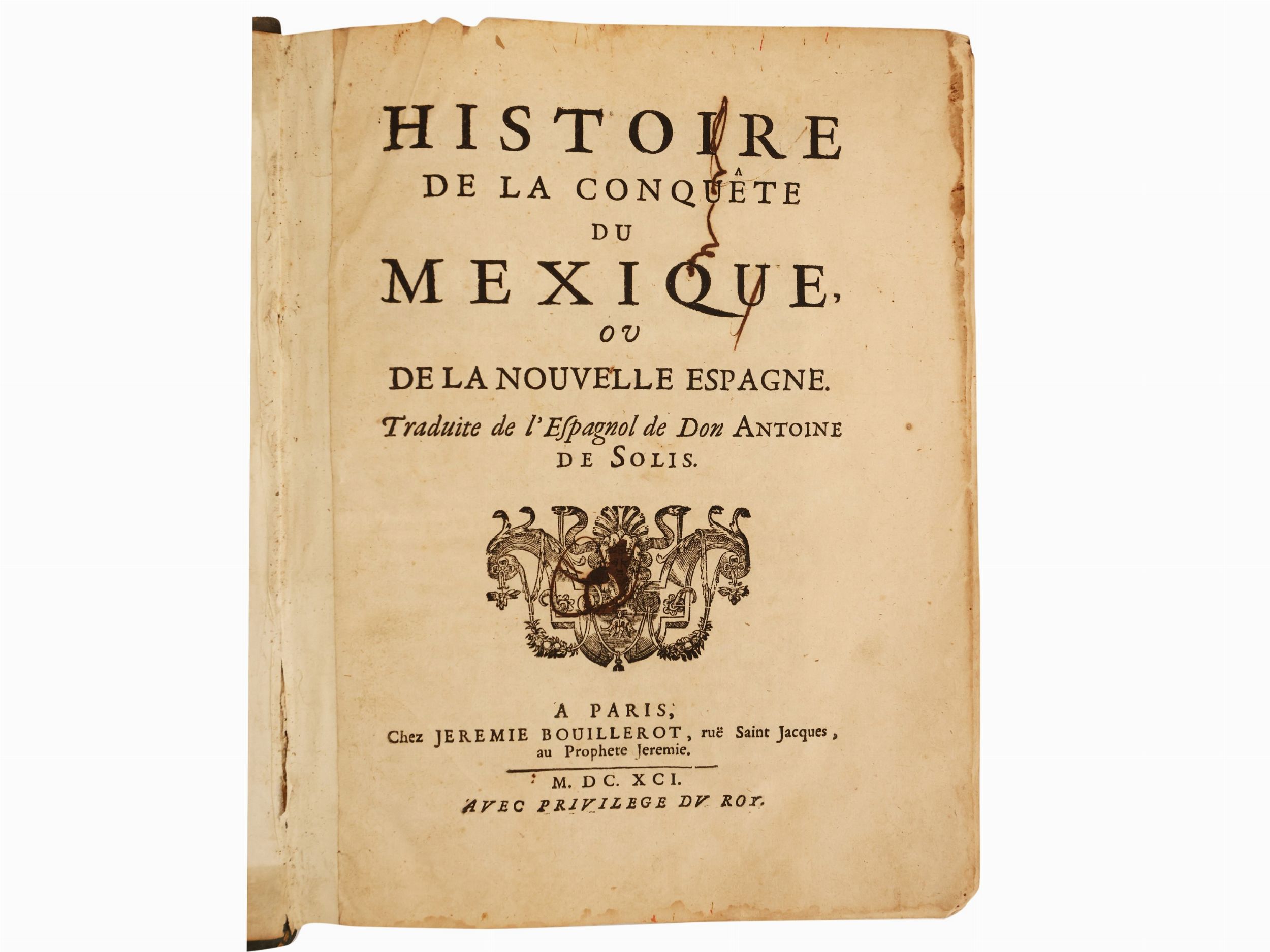 A Paris: Chez Jeremie Bouillerot, 1691, [30], 630, [26] p., 2 tav. (carte geografiche). Non presenti le 12 tav. incise. In-4° (255x200 mm). Fregi, capilettera, testatine e finalini xilografici. Legatura coeva con difetti, restauri ai risguardi, lievi fioriture e rare piccole macchie. Prima edizione francese del testo pubblicato per la prima volta in spagnolo nel 1684