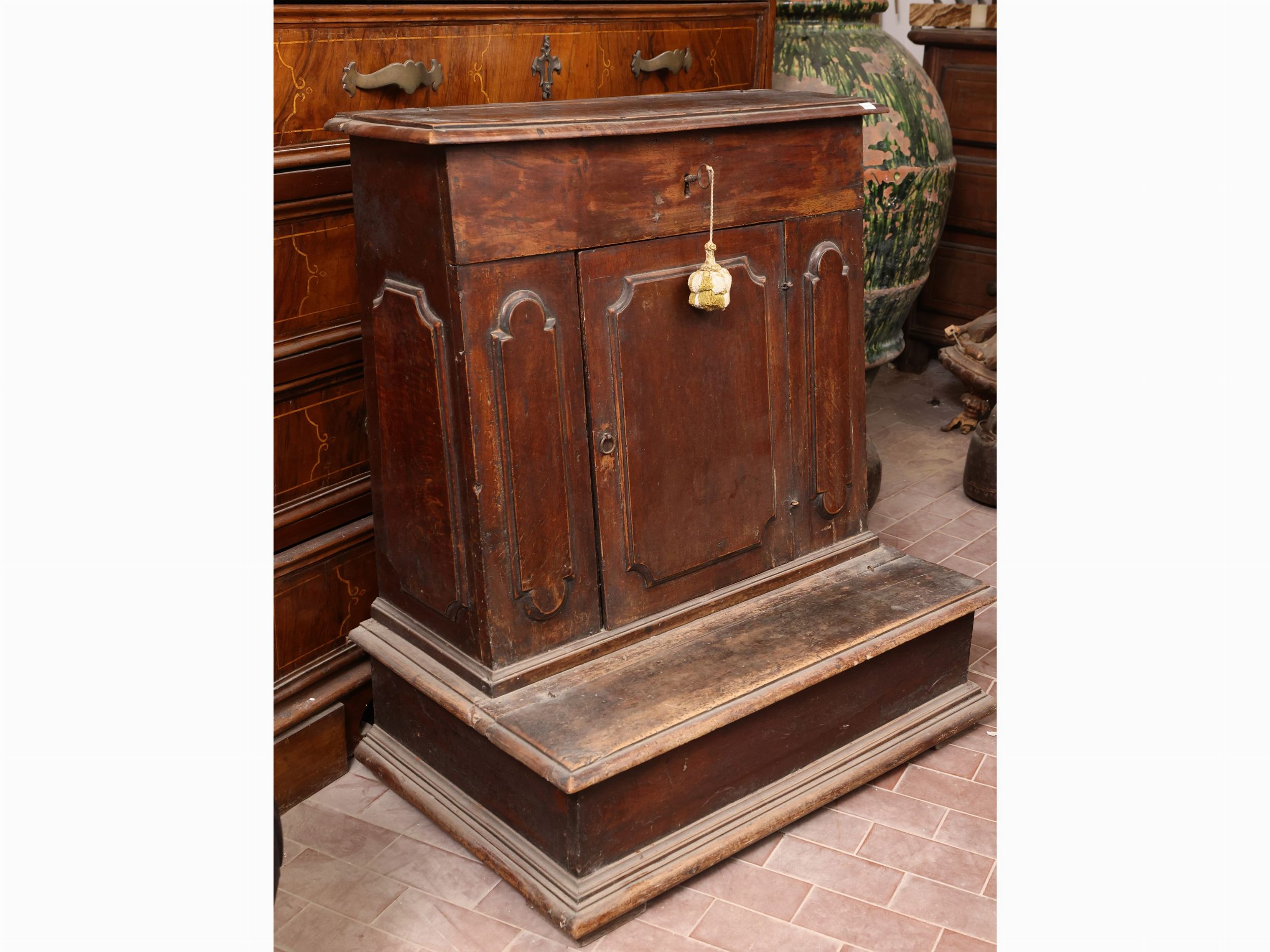XIX secolo vano ad alzarsi sul piano ed uno sulla base, uno sportello sul fronte a formelle, alcuni difetti