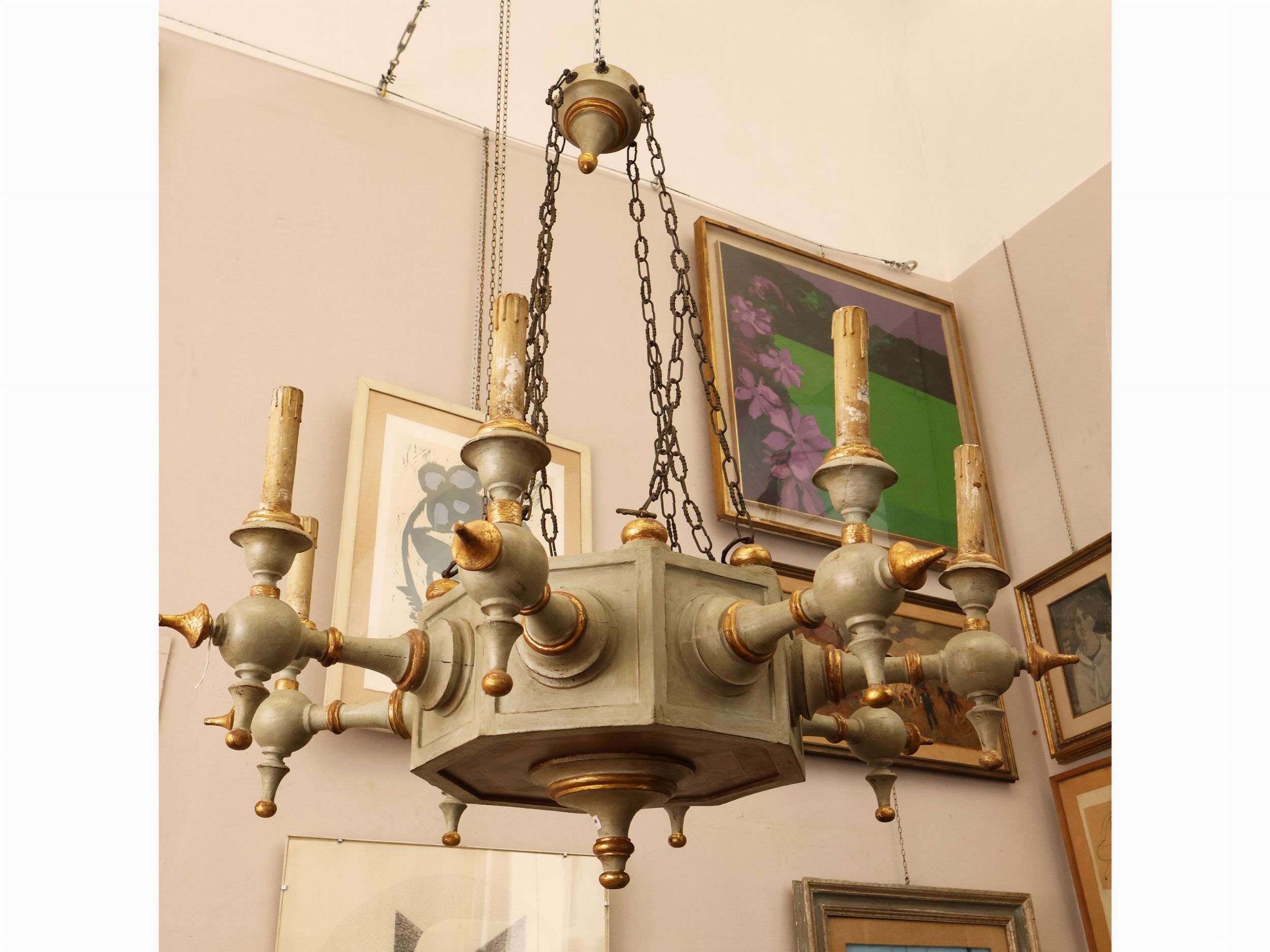 Lampadario in legno intagliato, laccato e lumeggiato in oro