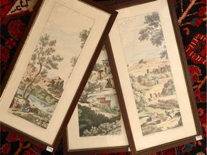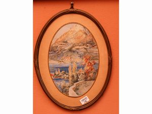 cm 15x19, cm 19x12,5 (4) due stampe su tessuto e due acquerelli su carta in ovale, gli acquerelli siglati H.L., [..]