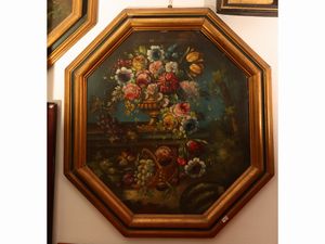 cm 66x60 (2) XX secolo coppia di dipinti ad olio su tela ottagonale, in cornice, alcuni difetti
