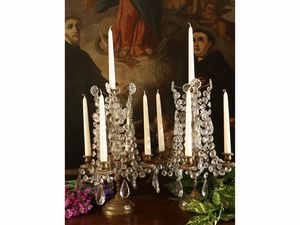 h cm 46x34 quattro bracci portacandele a doppia volute ed uno centrale, con catene e pendenti in vetro sfaccettato, [..]