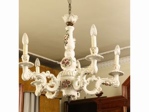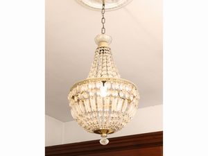 diam cm 38 inizio del XX secolo dipinto nei toni del verde e dell'ocra, baccellato, tre portalampade a grottesca, [..]