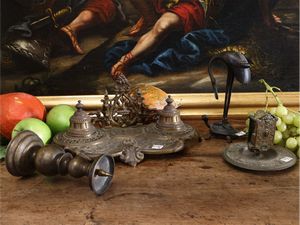 h da cm 11 a cm 21 (4) inizio del XX secolo composto da un calamaio, un portacerini, una piccola torciera ed [..]