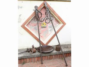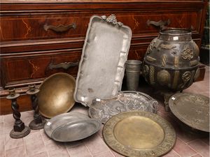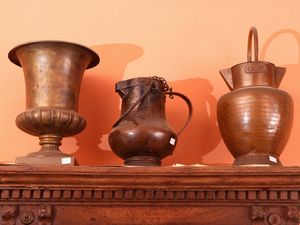 coppia di candelieri h cm 22, calderotto h cm 55 (10) XIX/XX secolo tra cui un calderotto in rame con applicazioni [..]
