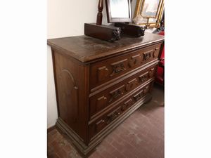 h cm 105x144x53 XVII secolo tre cassetti sul fronte con formelle sagomate, piedi a mensola