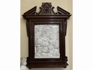 cornice h cm 92x70x18, la luce cm 48x35,5 XVII secolo cimasa aggettante a timpano spezzato, contenente formella [..]
