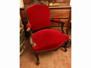 h cm 100x68x60 fine del XIX secolo imbottite e rivestite in velluto rosso, braccioli a giorno, gambe mosse su [..]