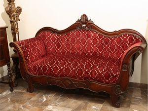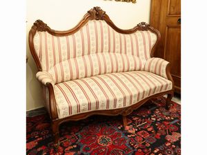 h cm 115x178x70 metà del XIX secolo schienale a triplice mossa con cimase a cartiglio, rivestito in tessuto rigato [..]