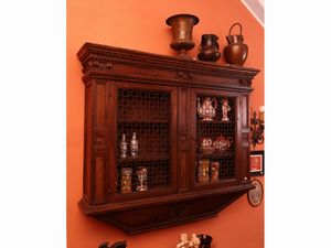 h cm 120x136x27 XVII secolo cappello aggettante con bordo a gocciolatoio, due sportelli a grata scanditi da tre [..]