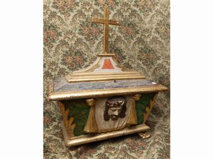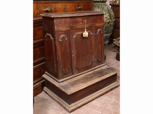 h cm 83x75x45 XIX secolo vano ad alzarsi sul piano ed uno sulla base, uno sportello sul fronte a formelle, alcuni [..]