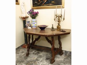 h cm 76x145x73 XVII secolo piano di forma trapezoidale con bordo a becco di civetta, base con sostegni a lira [..]