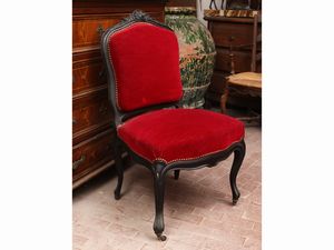 Serie di tre poltroncine in legno intagliato ebanizzato