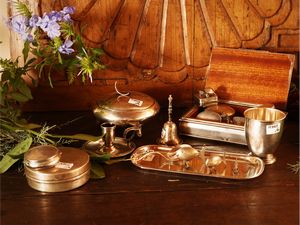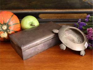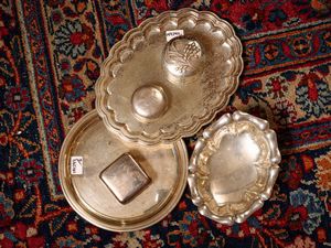 h cm 5,5x20x11, posacenere diam cm 14 (2) Germania, inizio XX secolo rivestita in lamina d'argento, coperchio [..]
