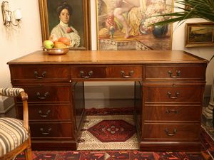 h cm 80x160x76 inizio del XX secolo piano rivestito in pelle marrone, tre cassetti nella fascia, i due laterali [..]