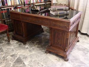 h cm 80x152x82 prima metà del XX secolo intagliata con volute vegetali e rosoni, piano incassato in vetro nero, [..]