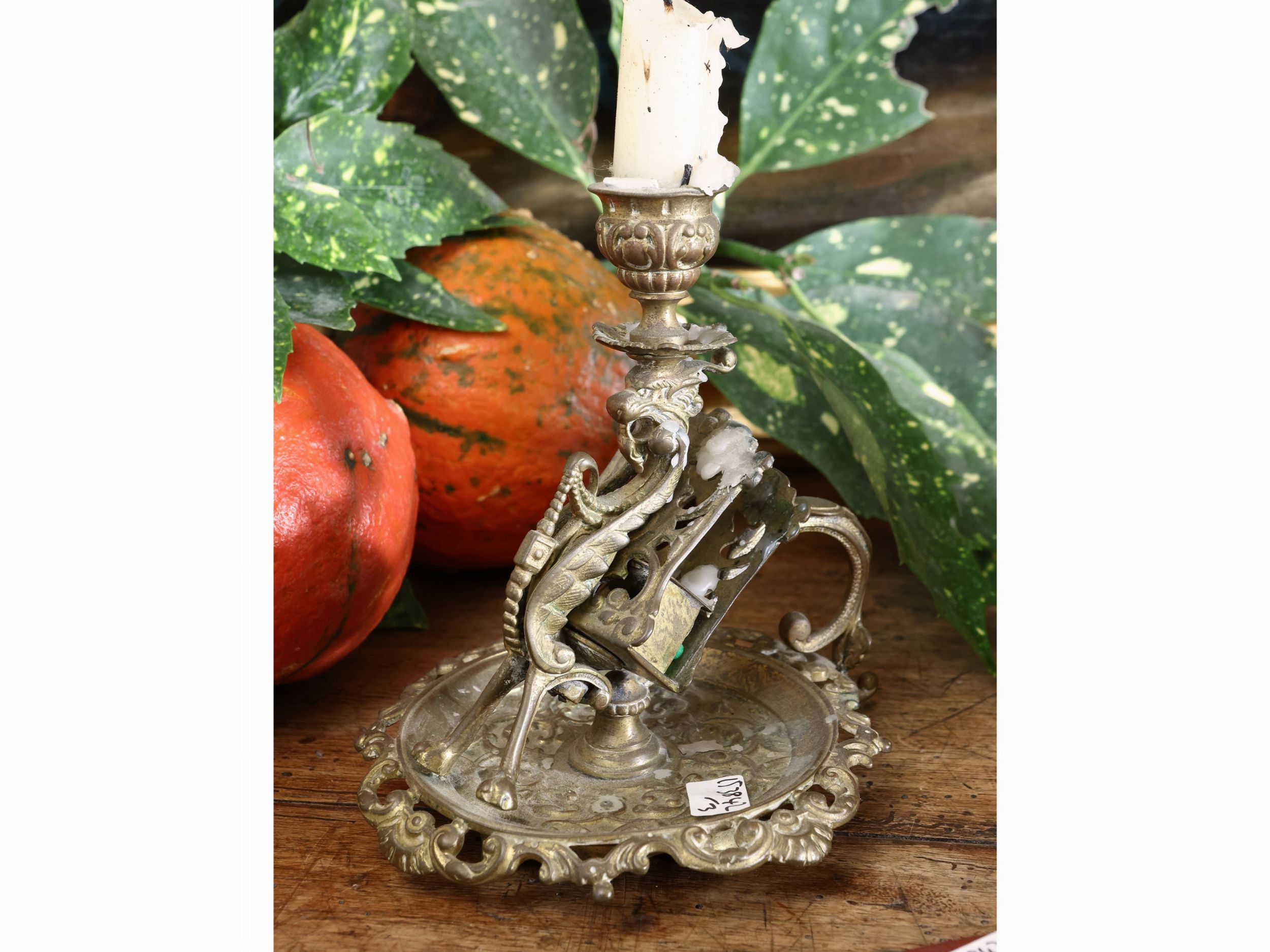h da cm 4 a cm 45 (3) inizio del XX secolo composto da un candelabro in antimonio dorato realizzato come un putto che sostiene un flambeau a quattro luci, base a plinto in marmo giallo di Siena, un fermacarte in due tipologie di marmo sormontato da lucertola in bronzo ed una bugia portacerini