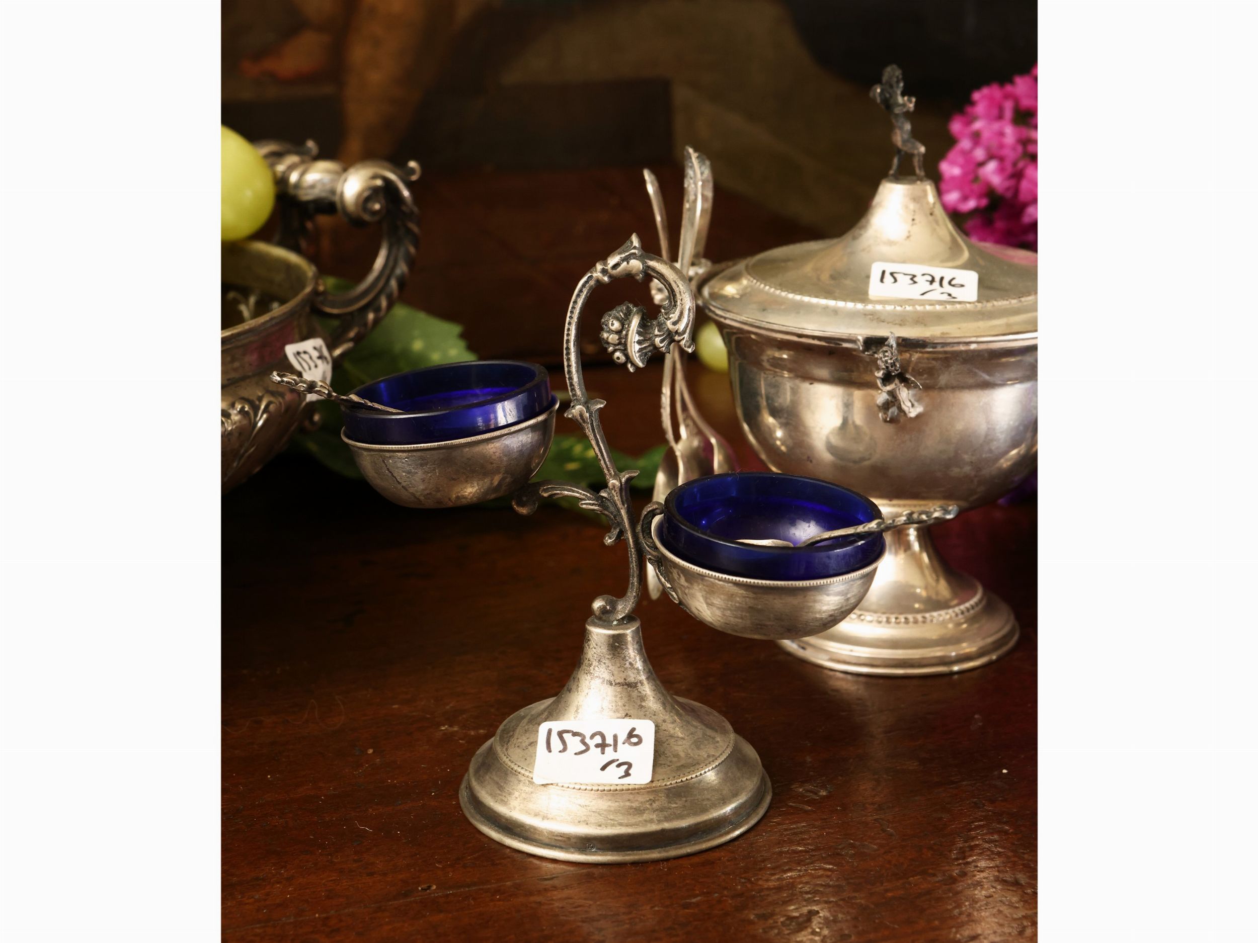 composto da un centrotavola ovale, una doppia saliera ed una zuccheriera corredata da sei cucchiaini (uno diverso), lievi difetti
