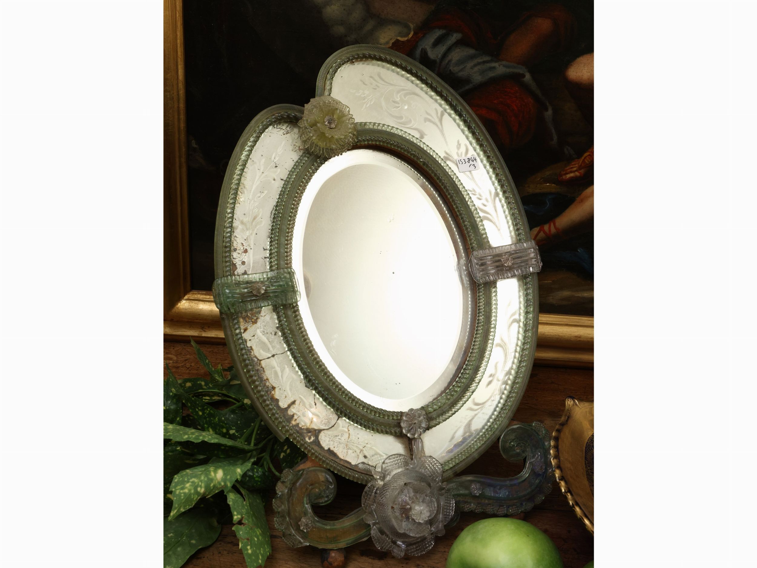 inizio del XX secolo composto da piccola specchiera incisa con dettagli in vetro soffiato verde, un centrotavola in vetro blu lumeggiato in oro ed un piccolo lume da tavolo di gusto Art Nouveau