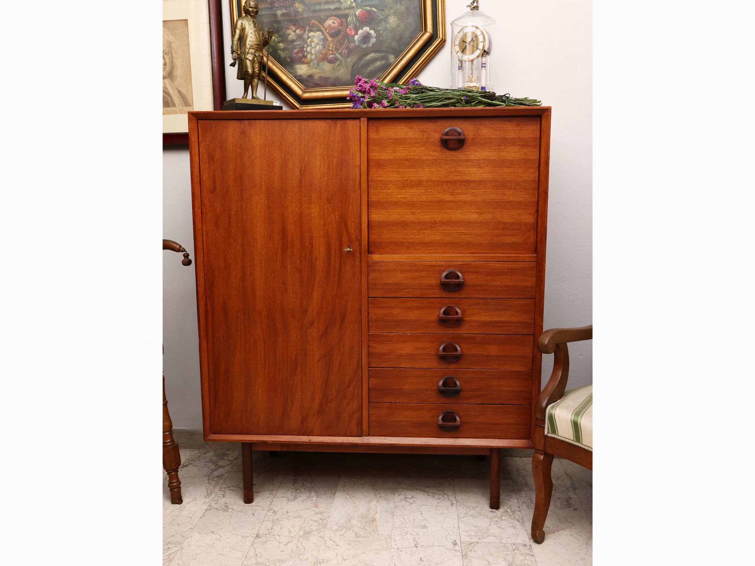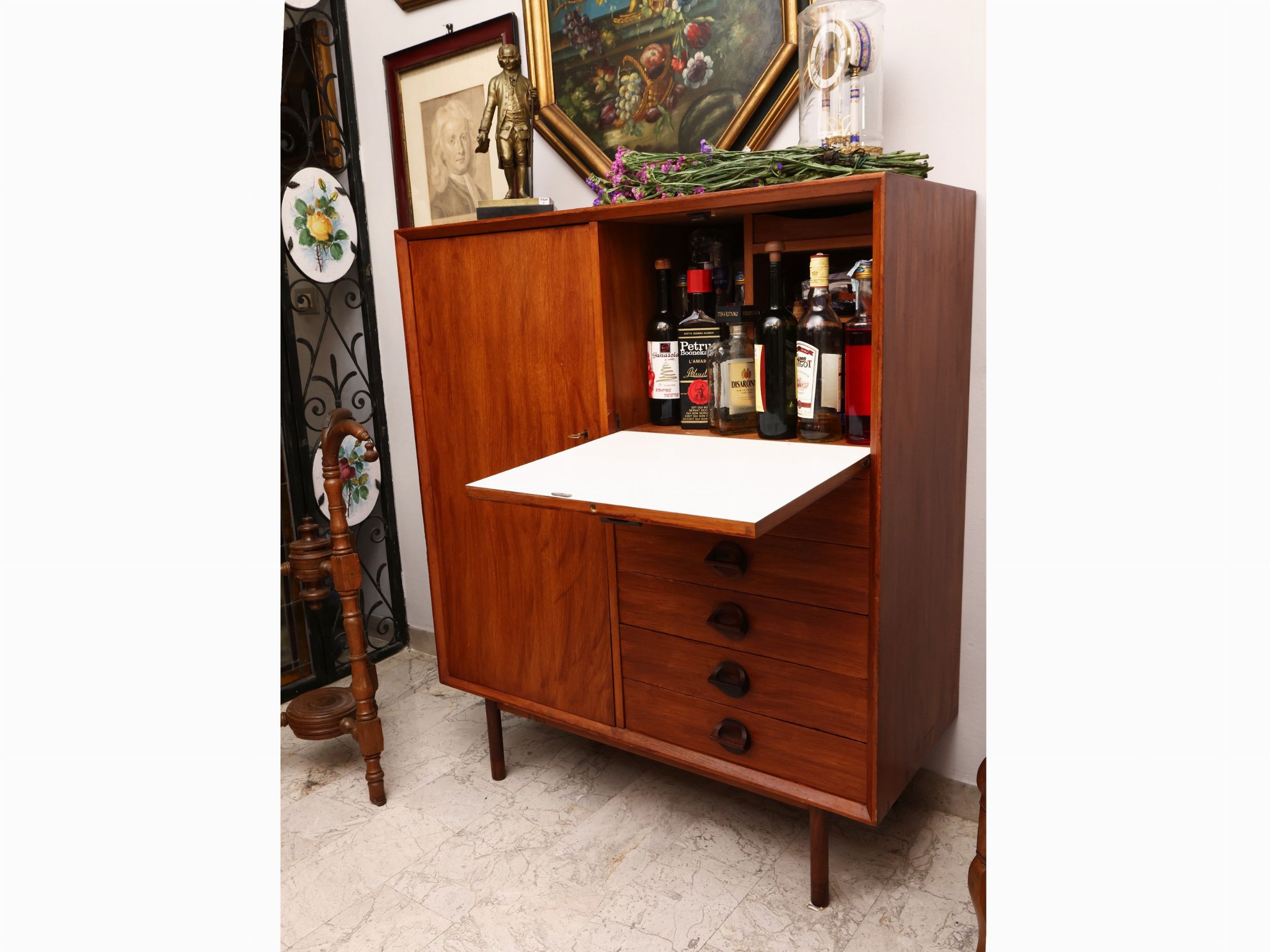 Anni Settanta sul fronte dritto due sportelli, di cui uno a calatoio con cinque cassetti sottostanti, piedi in metallo