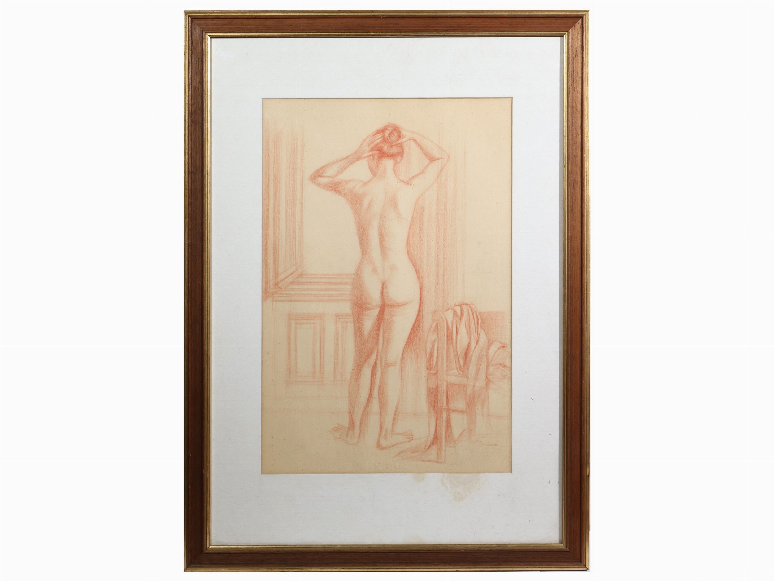 XX secolo sanguigna su carta, firmato, in cornice, lievi difetti, al verso il margine superiore è applicato al passepartout con del nastro adesivo