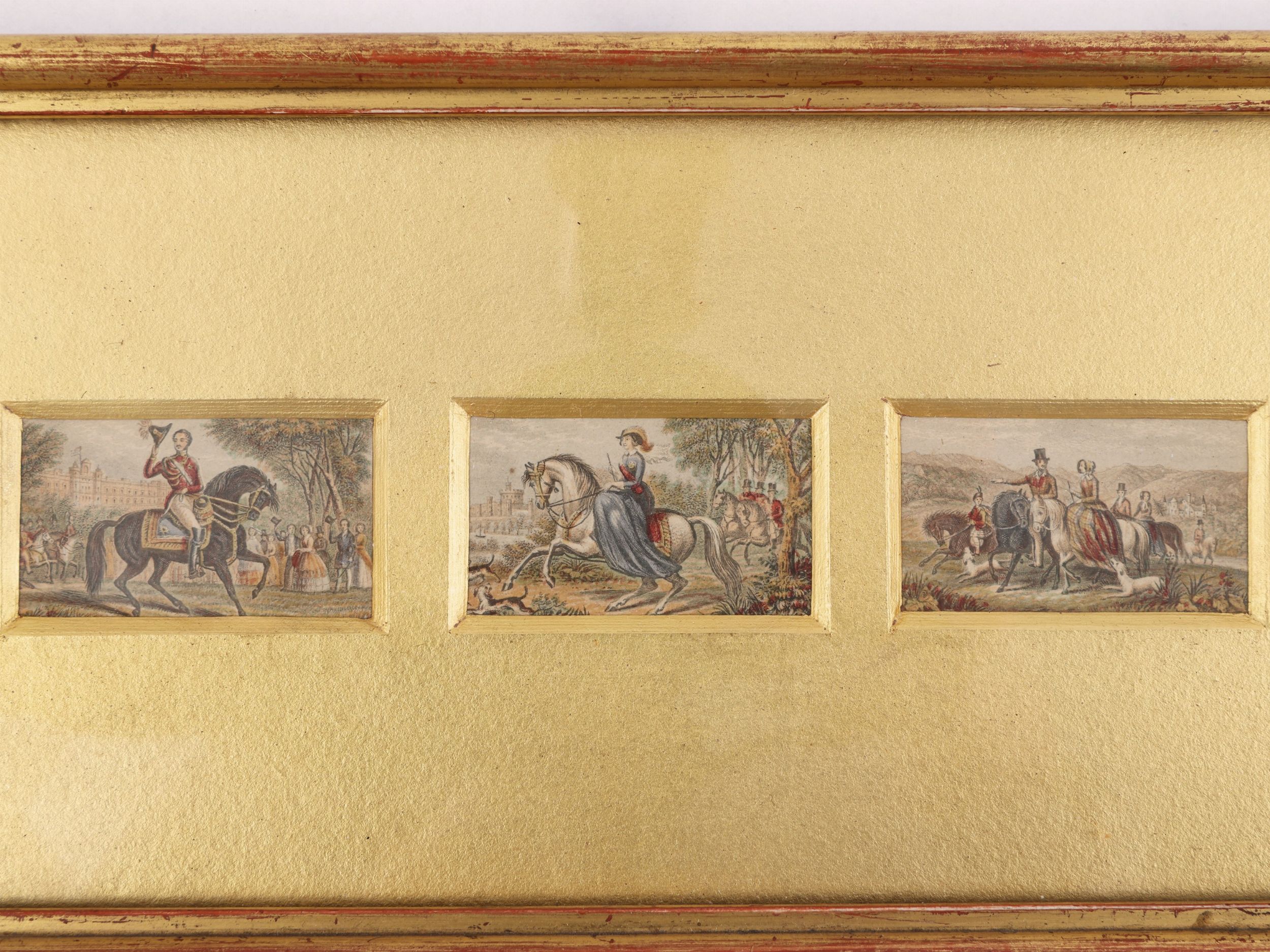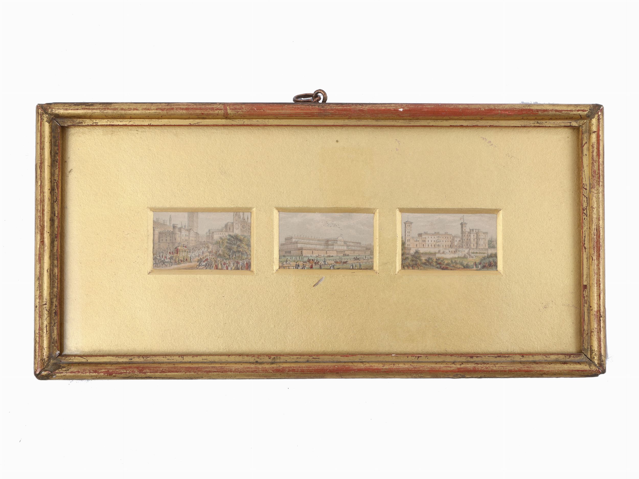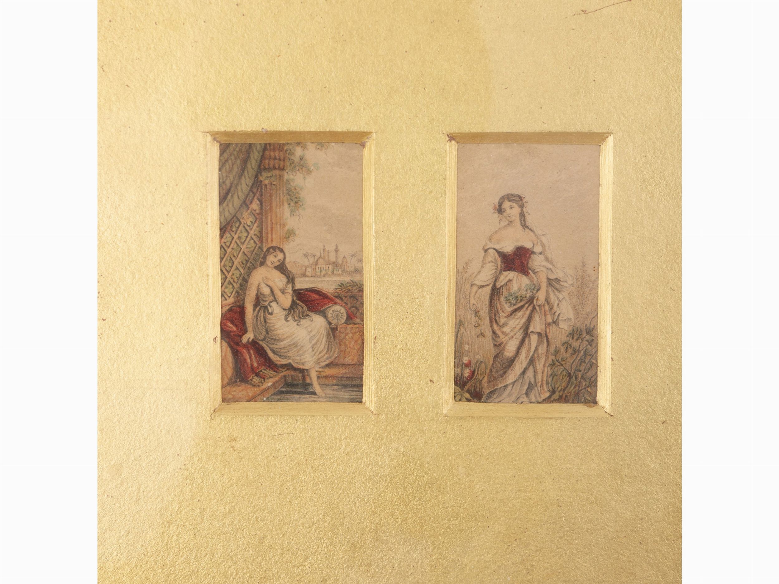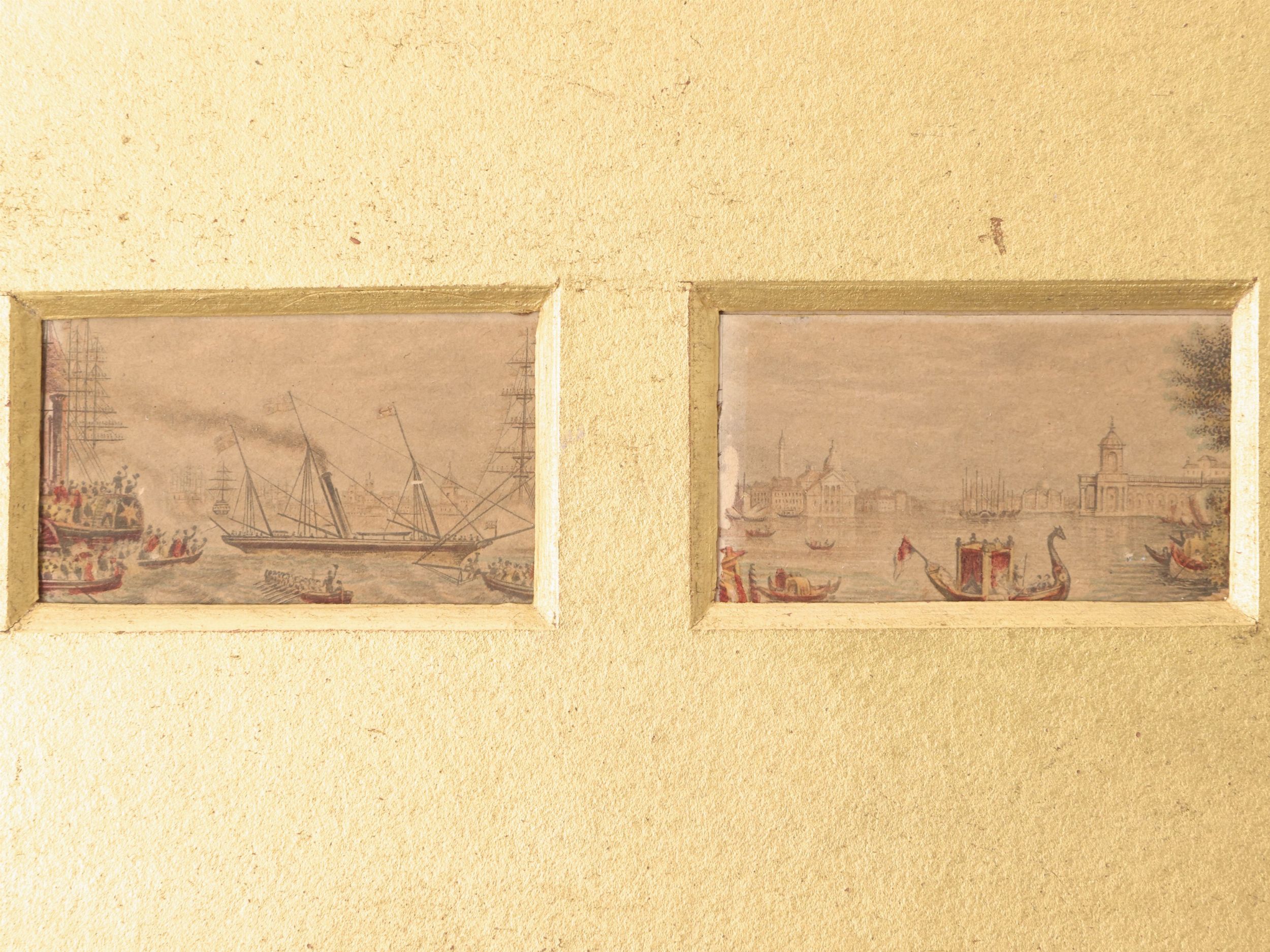 serie di incisioni policrome, raffiguranti figure femminili, vedute di porti e vedute di Londra, raccolte in quattro cornici, lievi difetti
