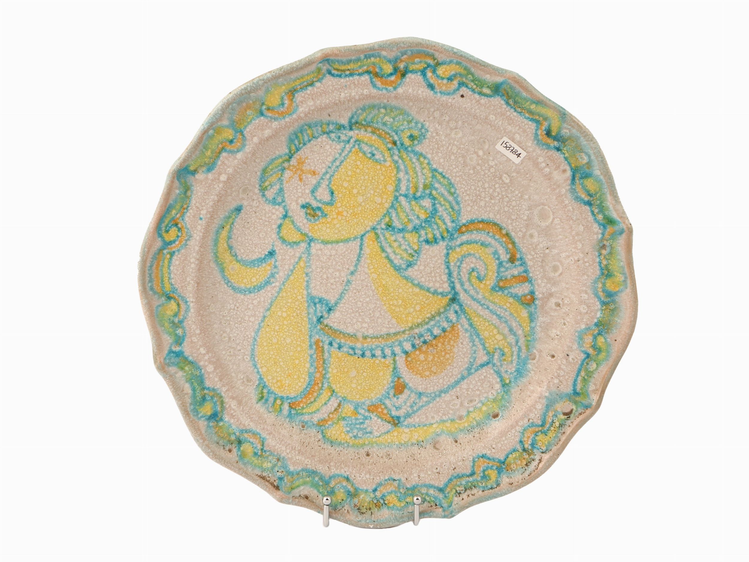 XX secolo dipinto con figura antropomorfa nei toni del giallo e dell'azzurro, bordo mosso