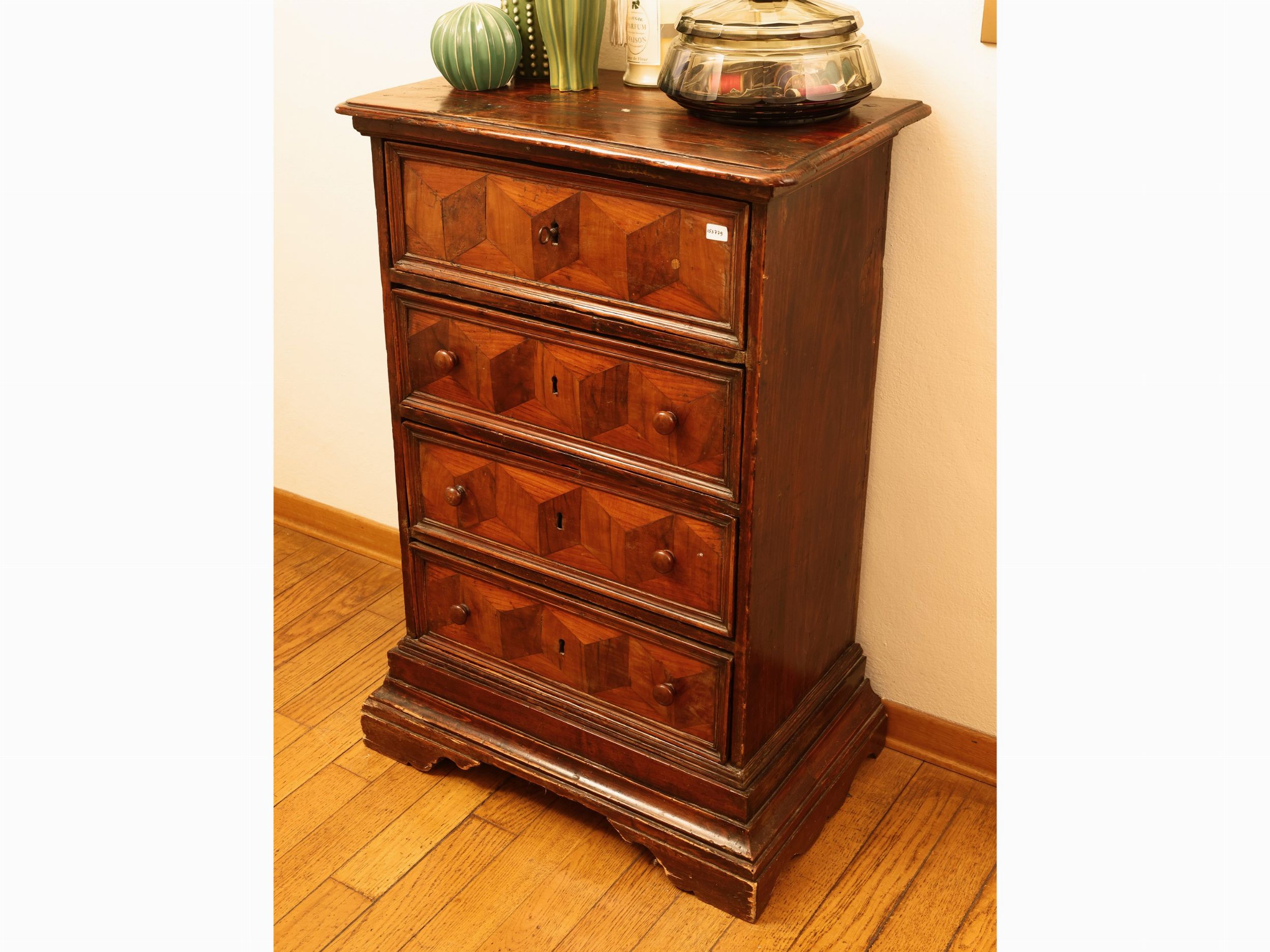 in parte del XVII secolo intarsiato in varie essenze con motivi geometrici, alcuni difetti