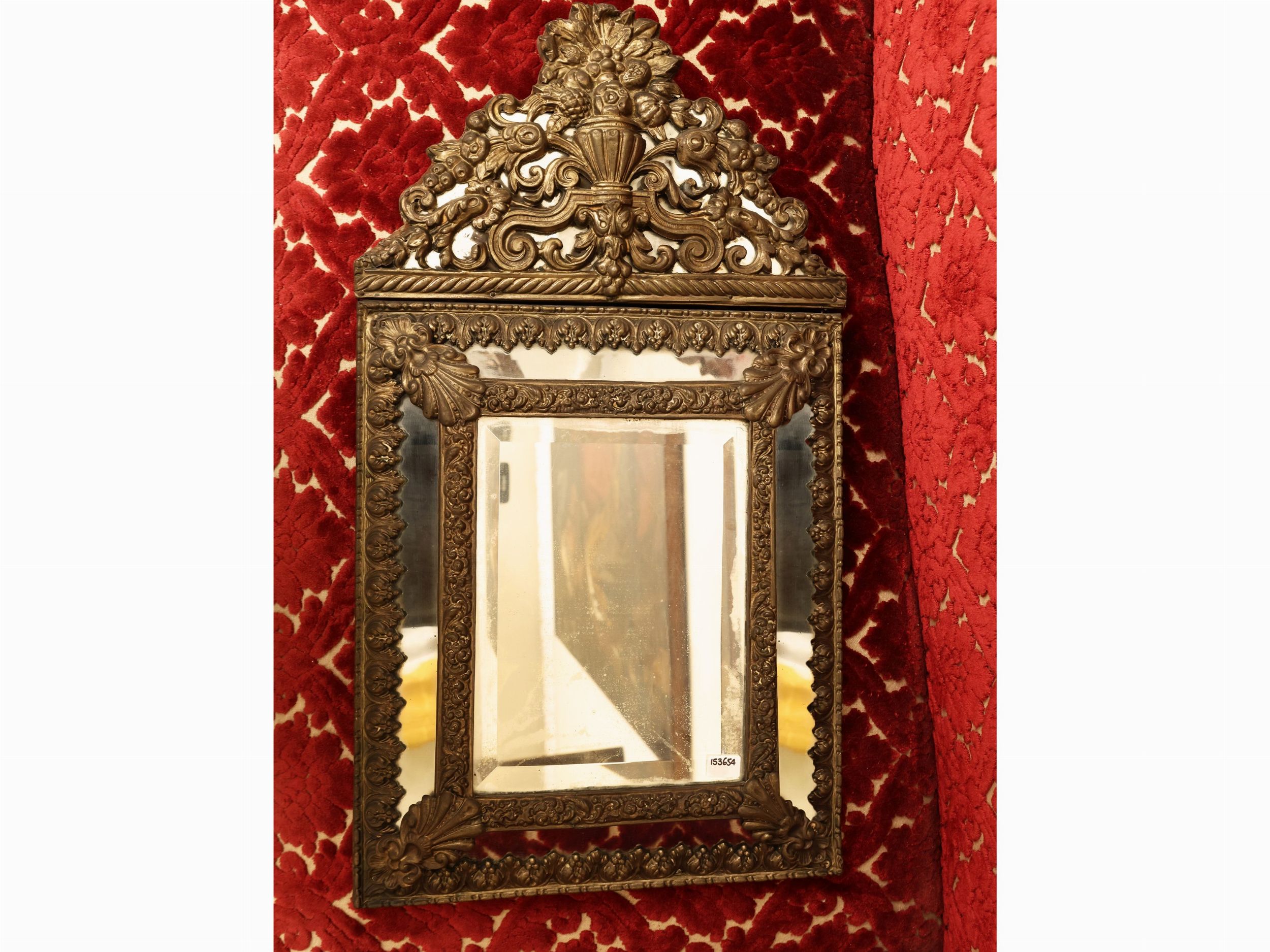 XIX secolo di gusto fiammingo, alta cimasa sbalzata con vaso centrale da cui ricadono volute e girali