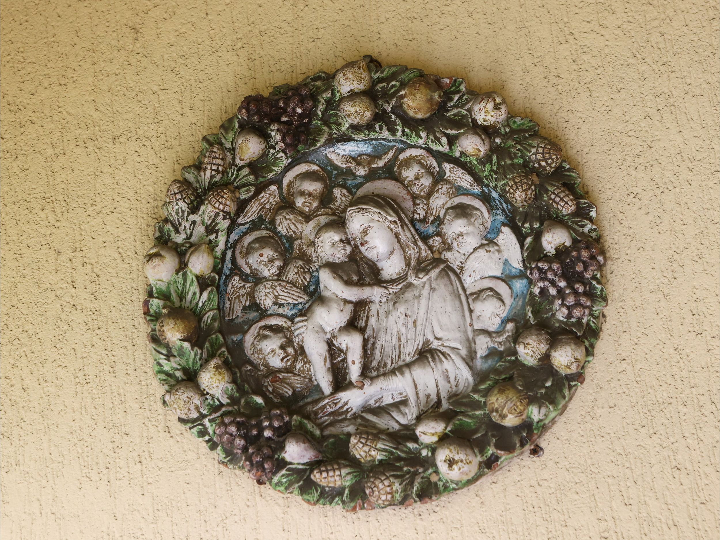 raffigurante ad altorilievo Madonna con Bambino fra angeli entro ghirlanda di frutta, lievi difetti