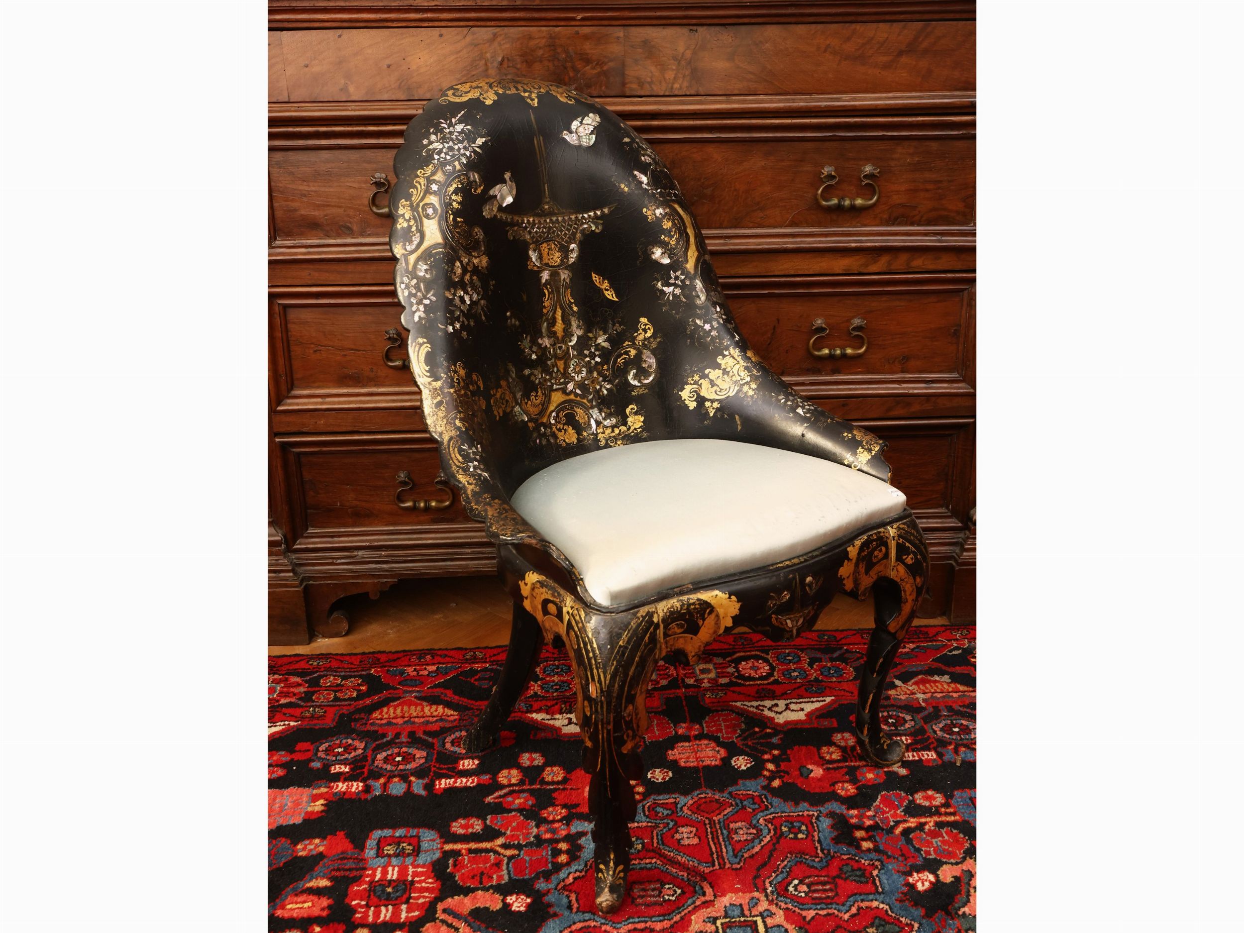 metà del XIX secolo lumeggiata in oro e riccamente decorata con incrostazioni in madreperla a raffigurare una fontana con volatili, seduta rivestita in raso celeste, alcuni difetti