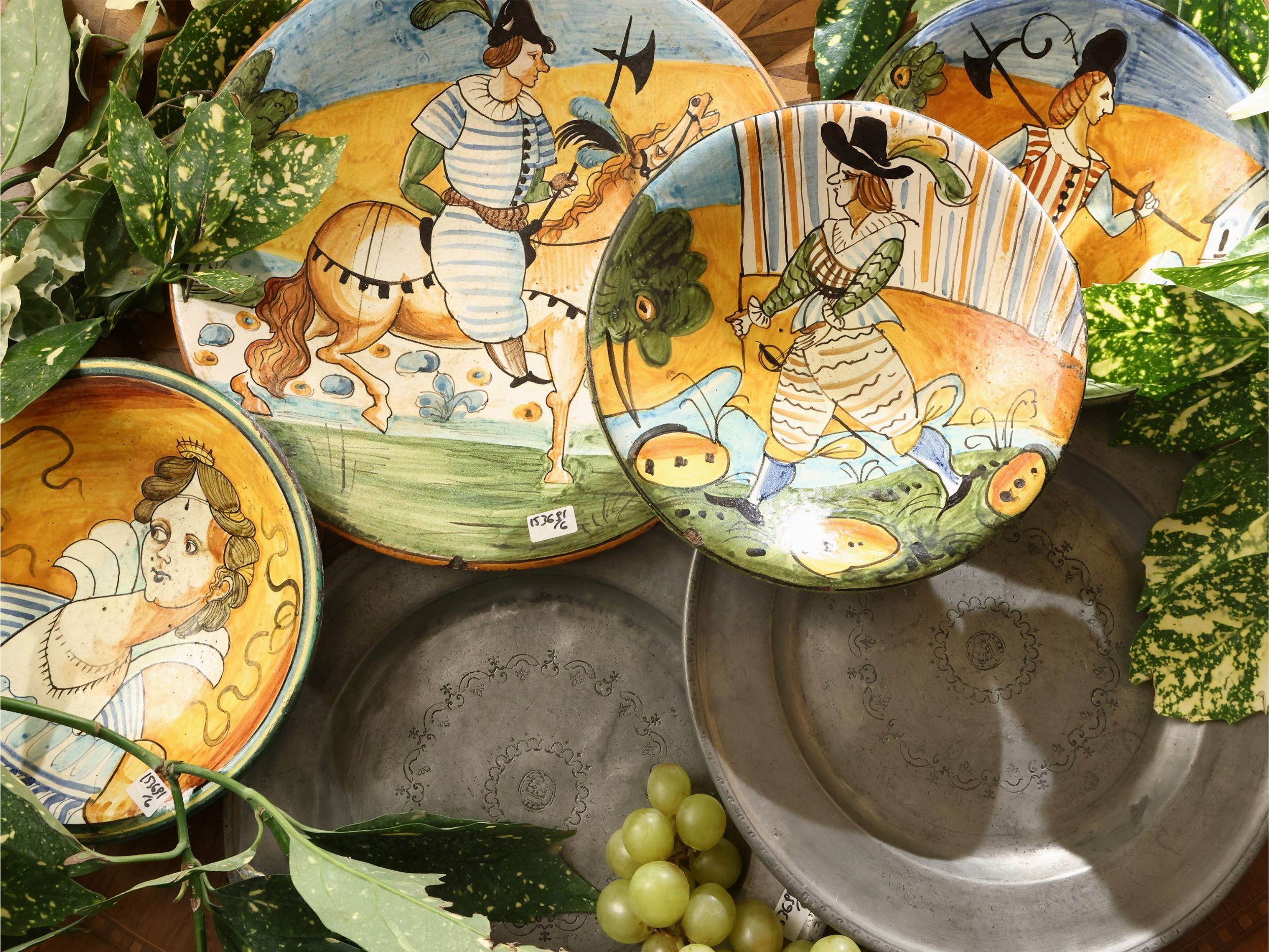 XX secolo realizzati ad imitazione delle maioliche figurate del XVII secolo, abbinati a due piatti d'epoca in peltro, alcuni difetti