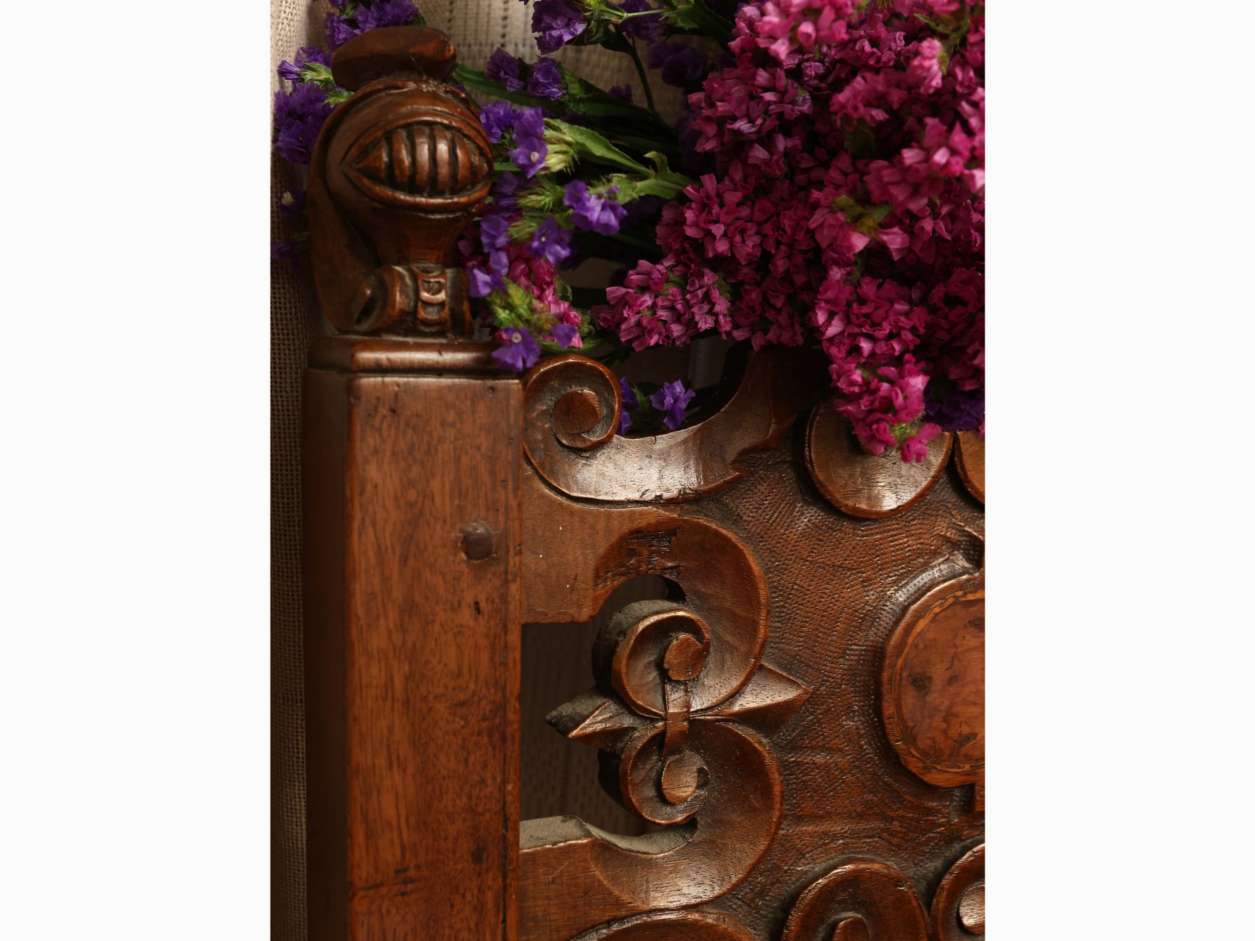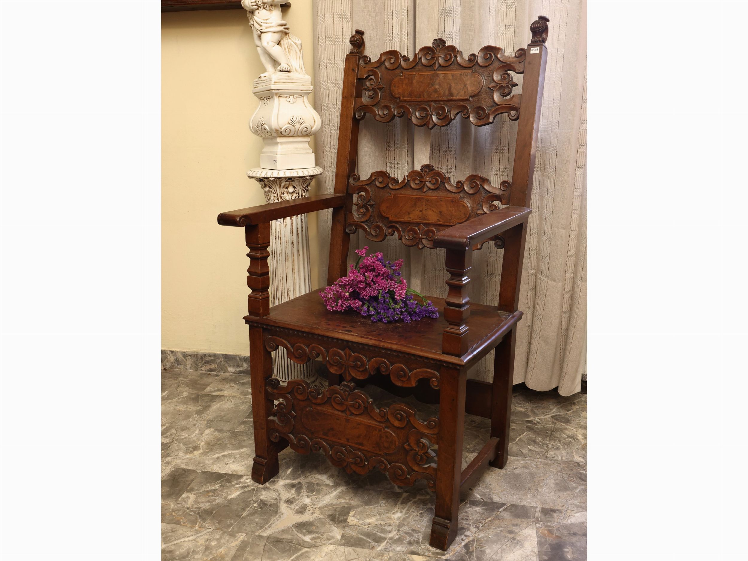 XVII secolo schienale dritto con doppia cartella riccamente intagliata a volute, motivi che si ripetono nella pendaglina e nella cartella anteriore, finali scolpiti come elmi, difetti al sedile