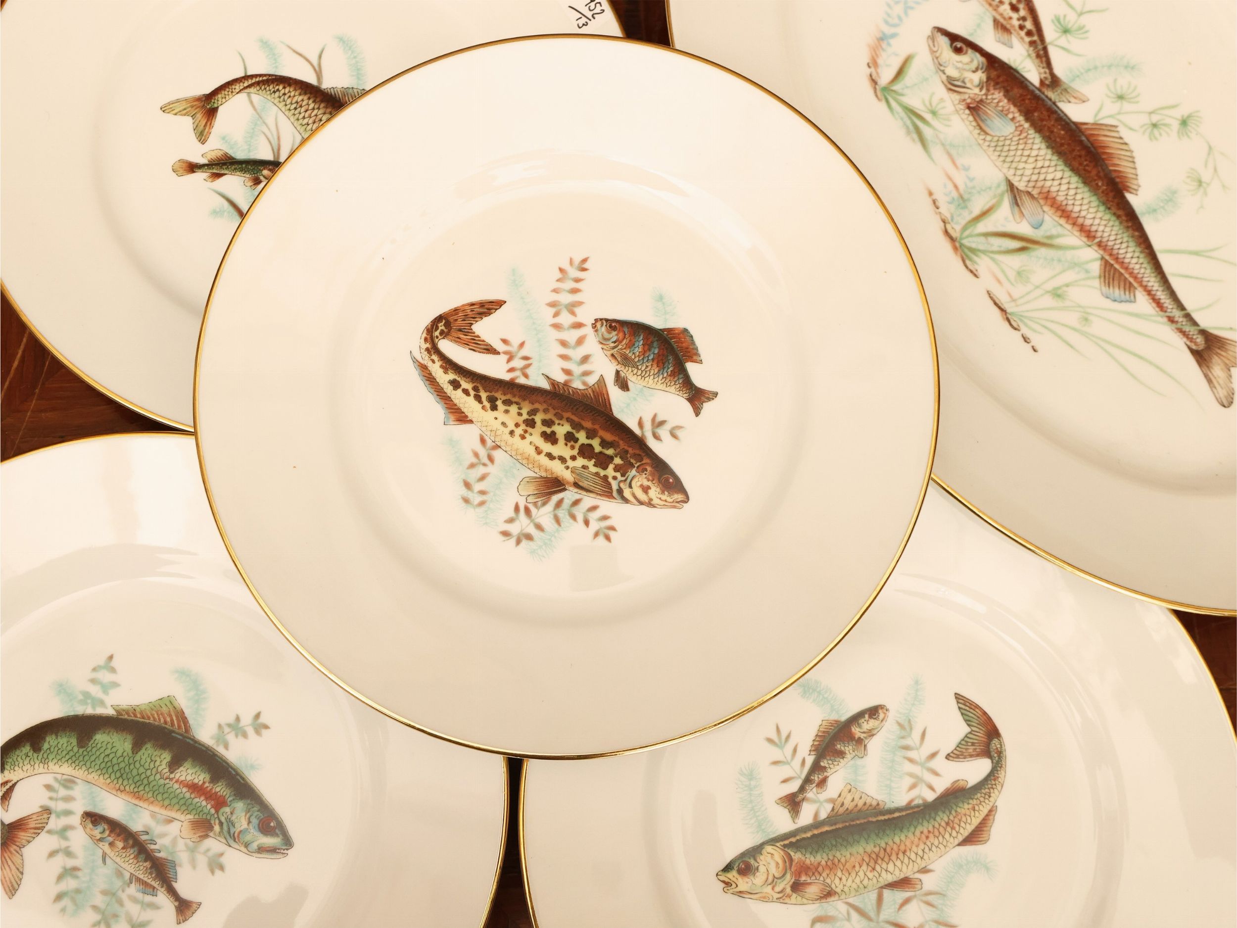 XX secolo decorato con varie tipologie di pesci di acqua dolce e piante marine, bordo oro, composto da 12 piatti piani ed una pesciera