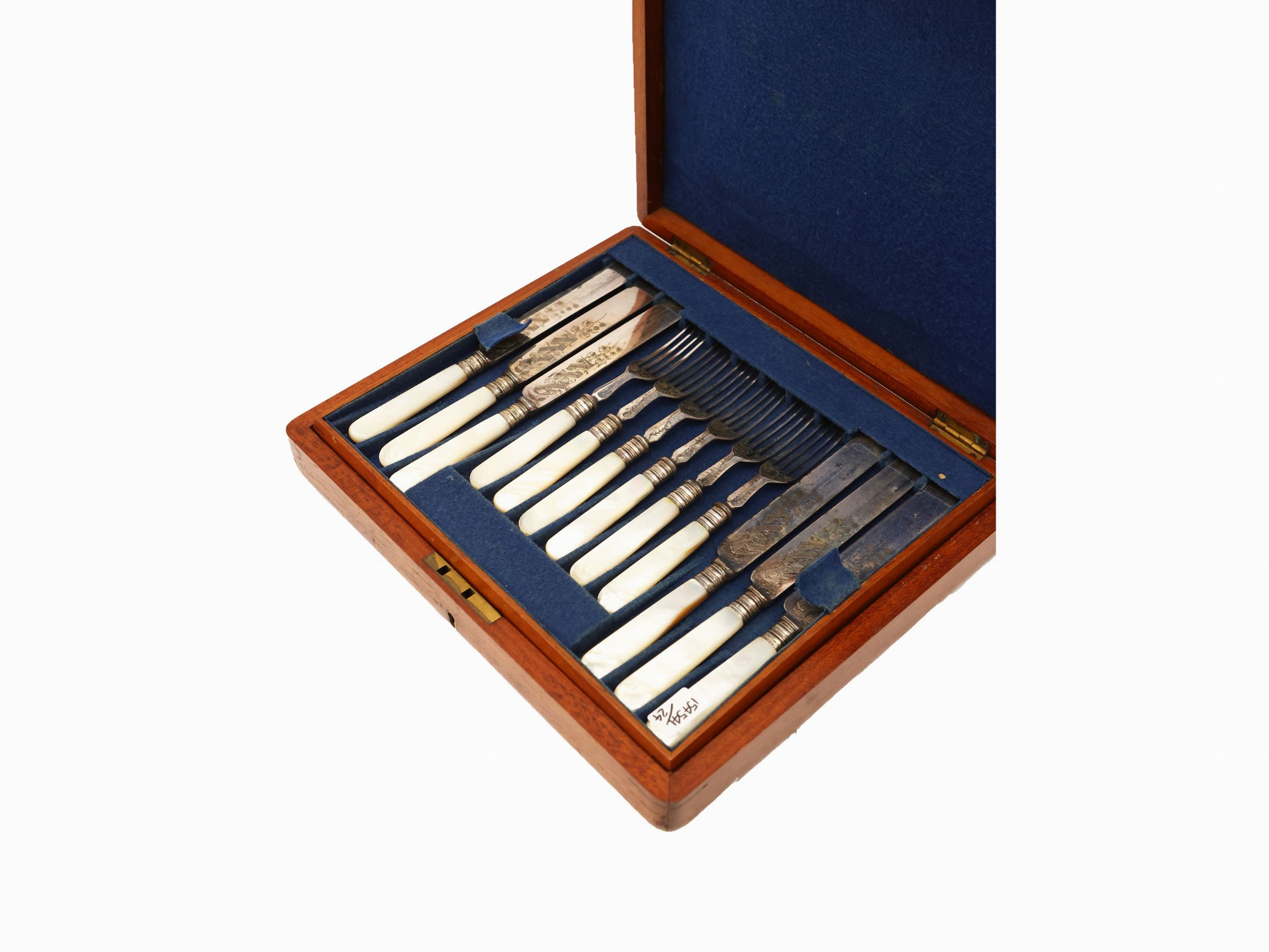 Inghilterra, inizio del XX secolo completo per 12 persone, composto da 12 forchettine e 12 coltellini con manici in madreperla e lame incise con motivo floreale, contenuto entro cofanetto originale in noce (24)
