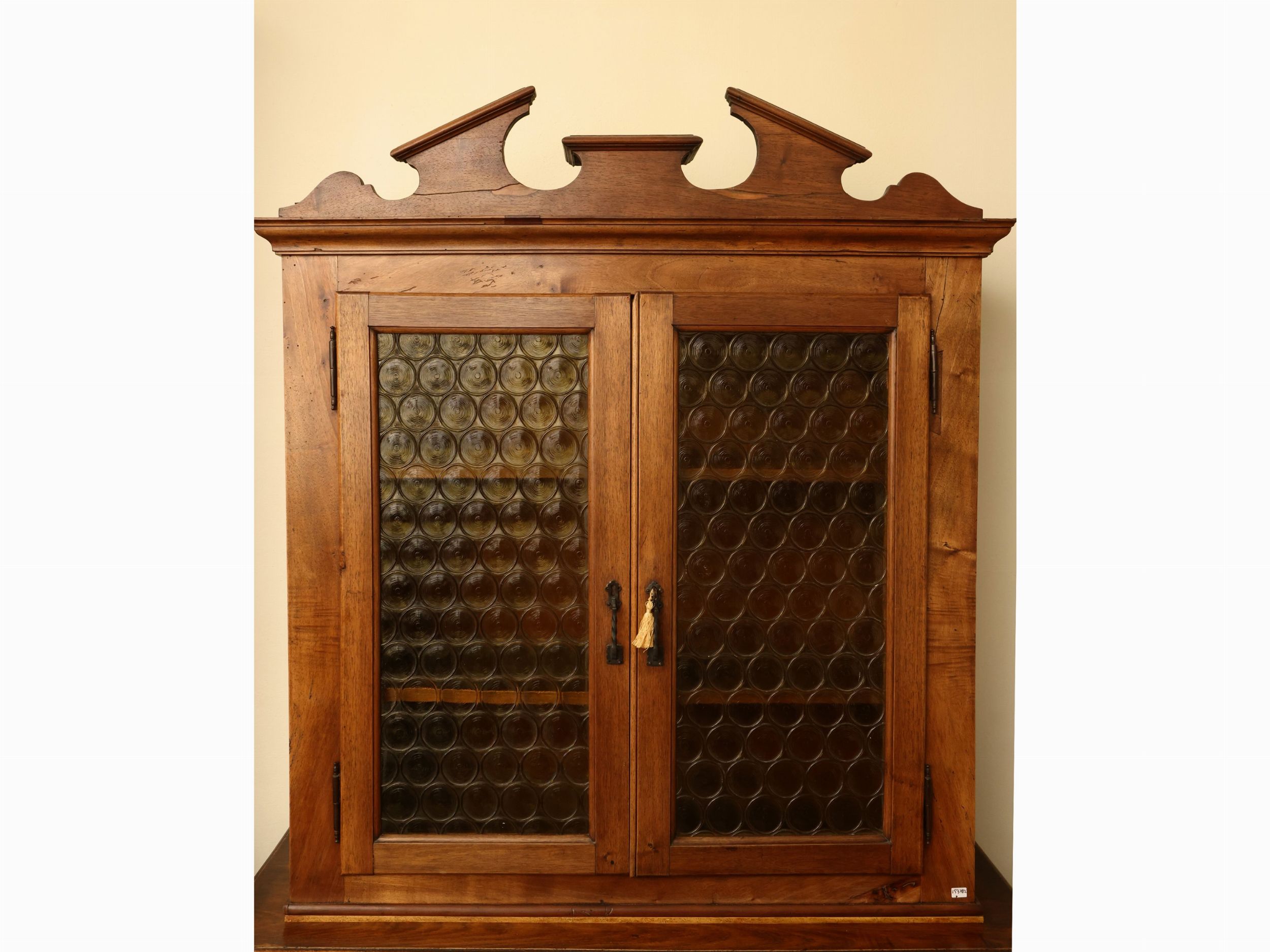 inizio del XX secolo cimasa a timpano spezzato, due sportelli con vetri color ocra