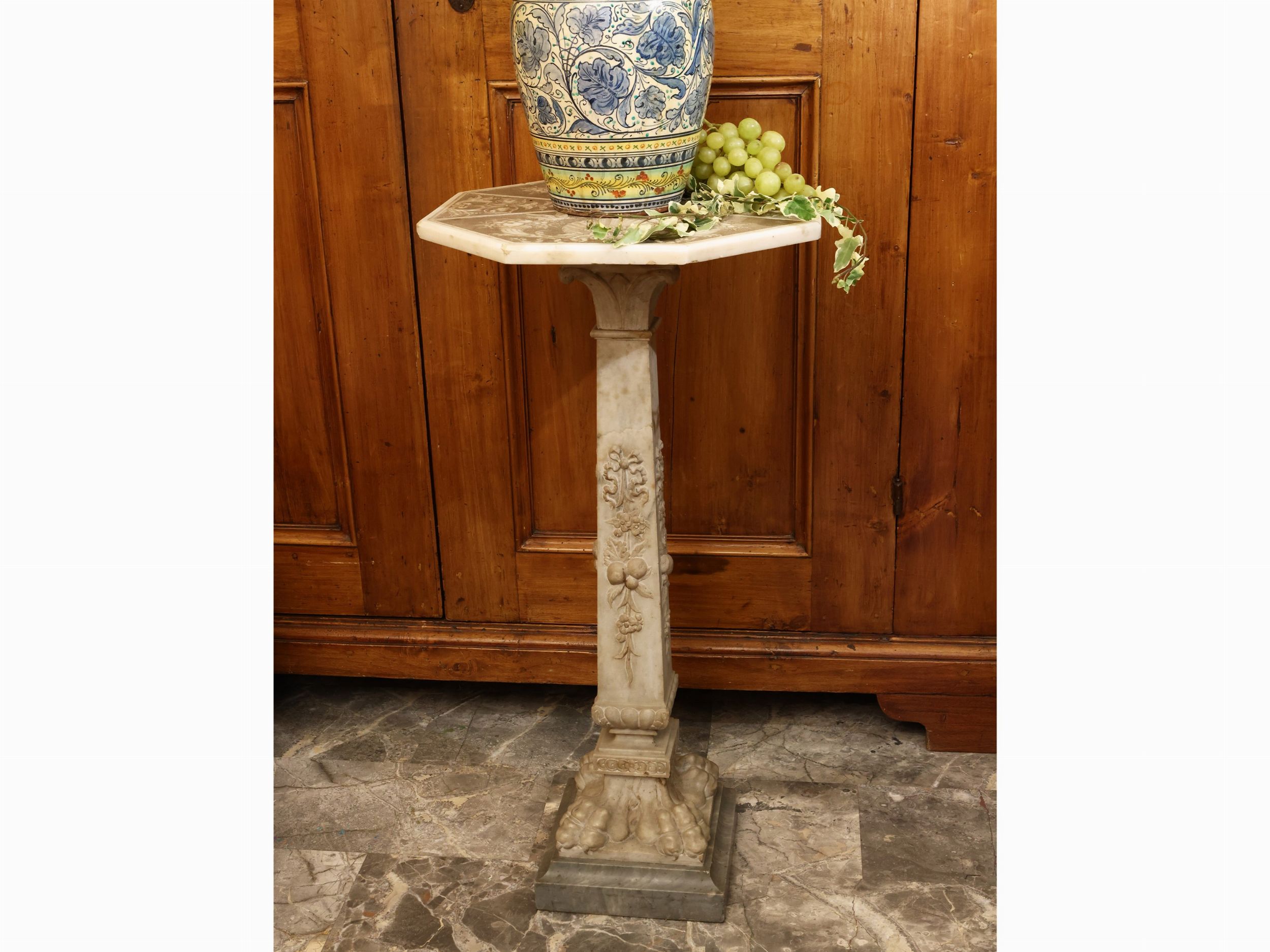 h cm 91x49 fine del XIX secolo piano di forma ottagonale finemente scolpito a bassorilievo con motivi di conchiglie tra cornucopie ricolme di frutti, fiori, volatili e volute vegetali, sostegno centrale a colonna a sezione quadrata, scolpita con trionfo di frutti su piede zoomorfo quadripartito, base in marmo grigio, difetti al piano (rotture restaurate)