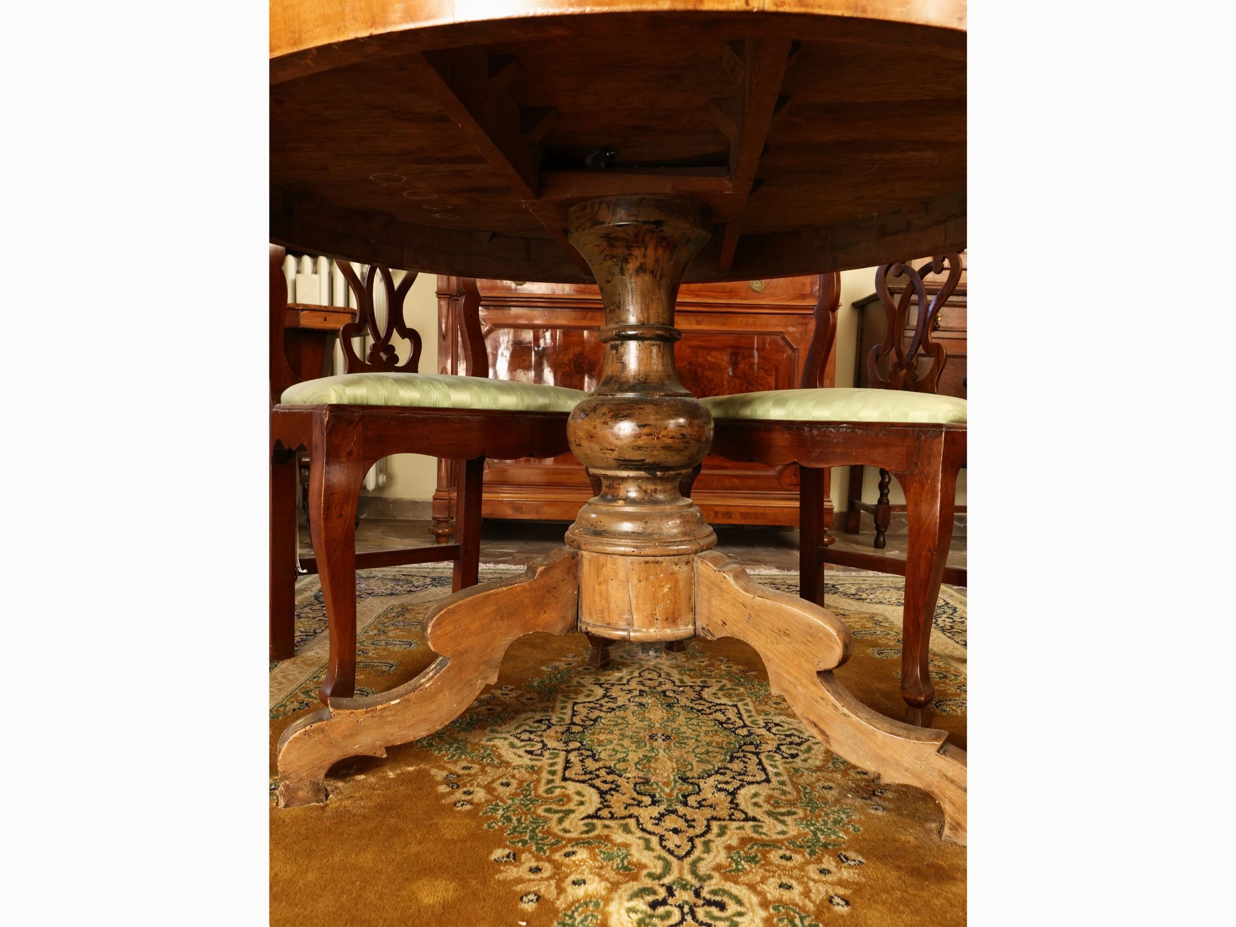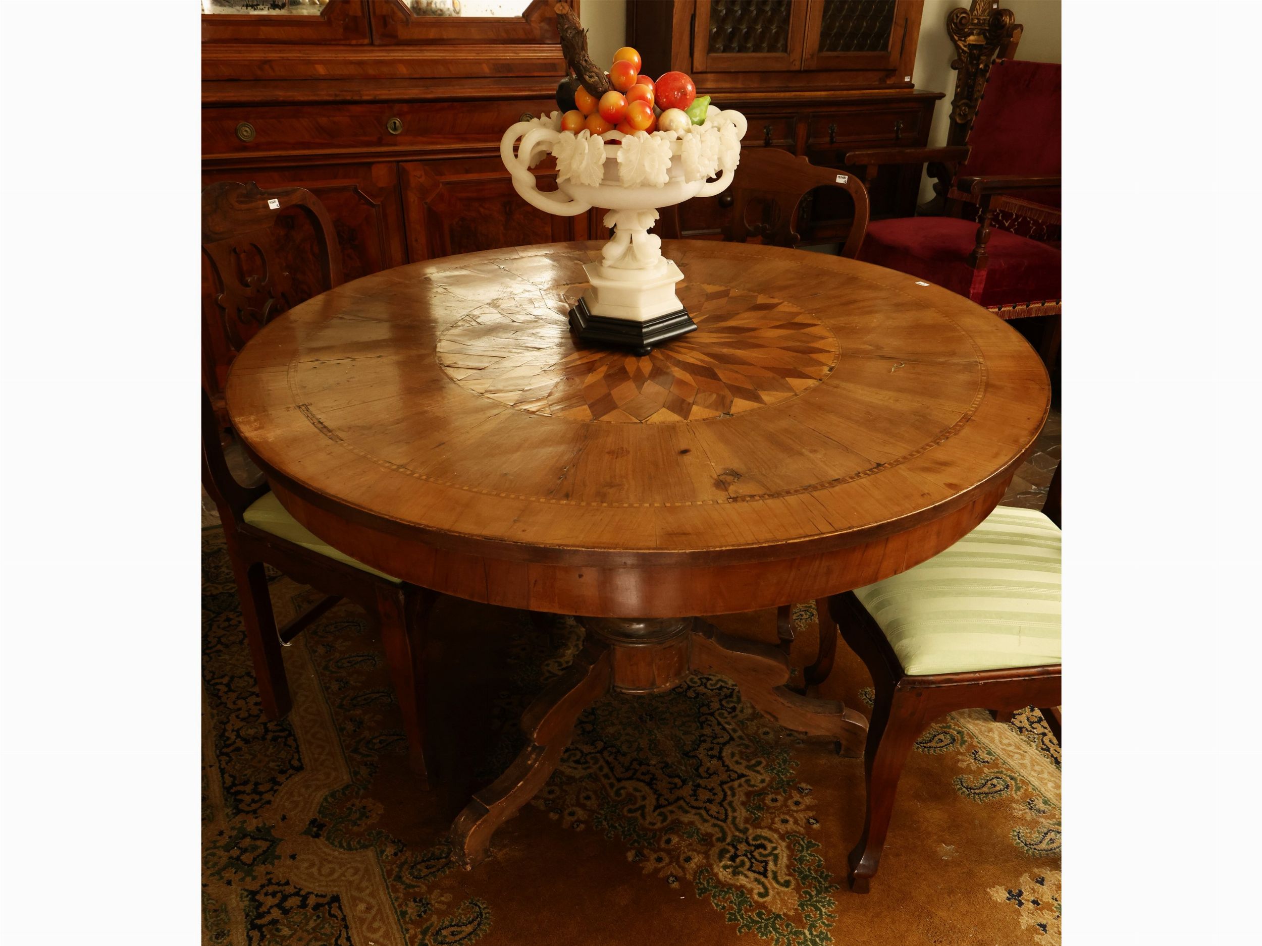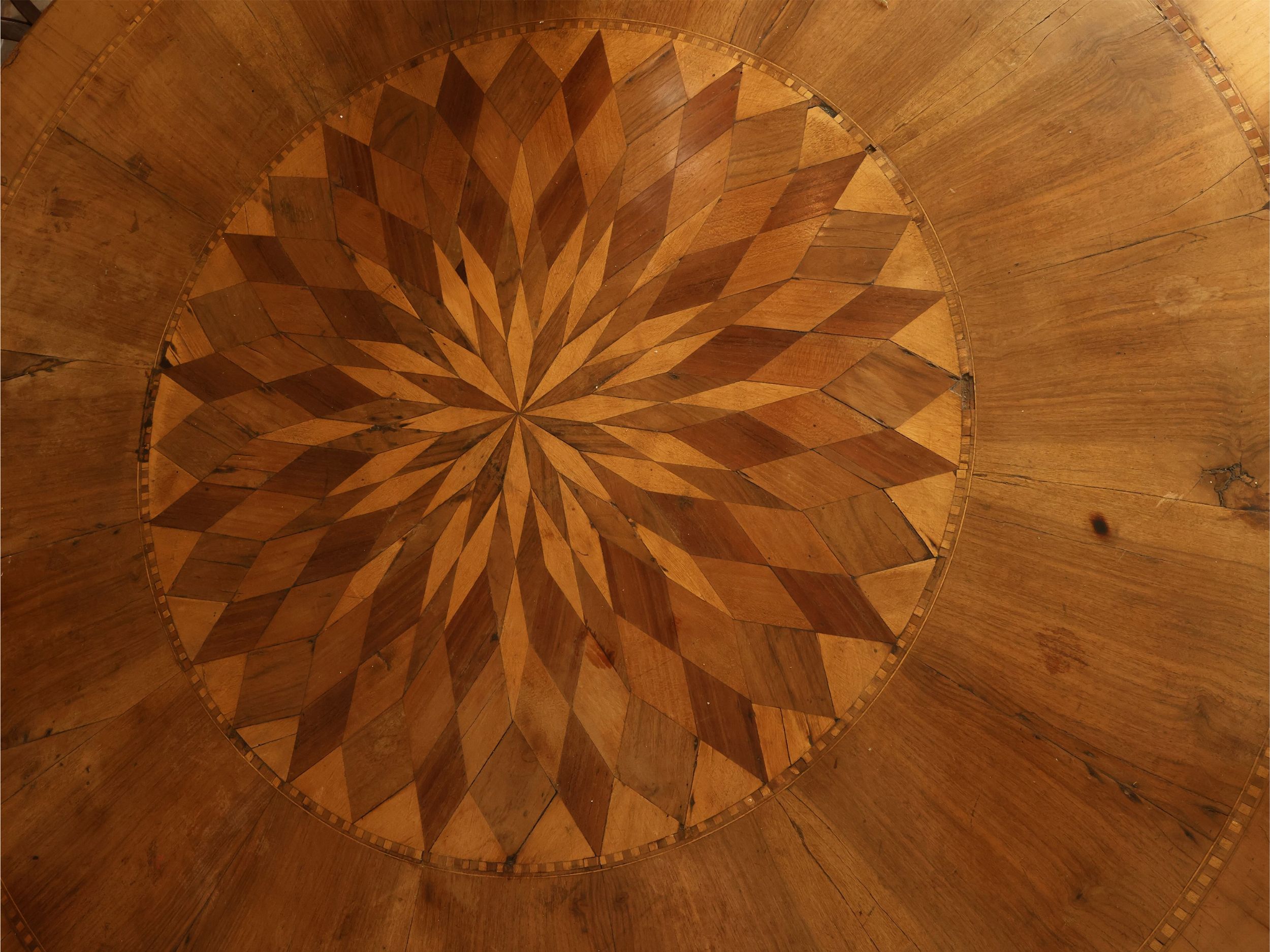Emilia, metà del XIX secolo piano circolare intarsiato in legni di frutto con motivi concentrici romboidali a formare un rosone, sostegno centrale tornito su tre piedi a doppia volute, difetti