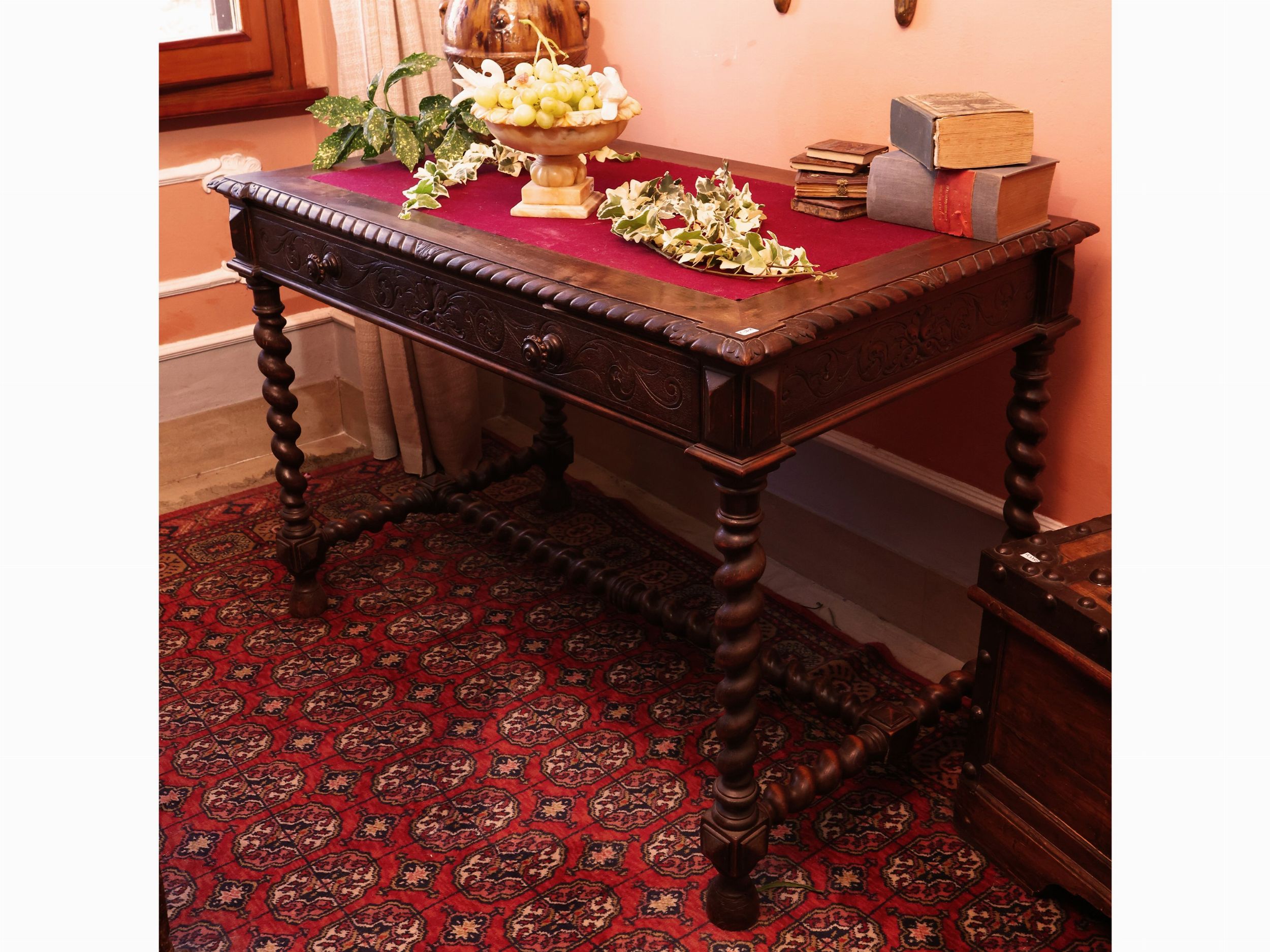 inizio del XX secolo realizzato in stile neorinascimentale, piano in panno rosso con bordo intagliato a cordonetto, un cassetto nella fascia, gambe e traverse a torchon, alcuni difetti